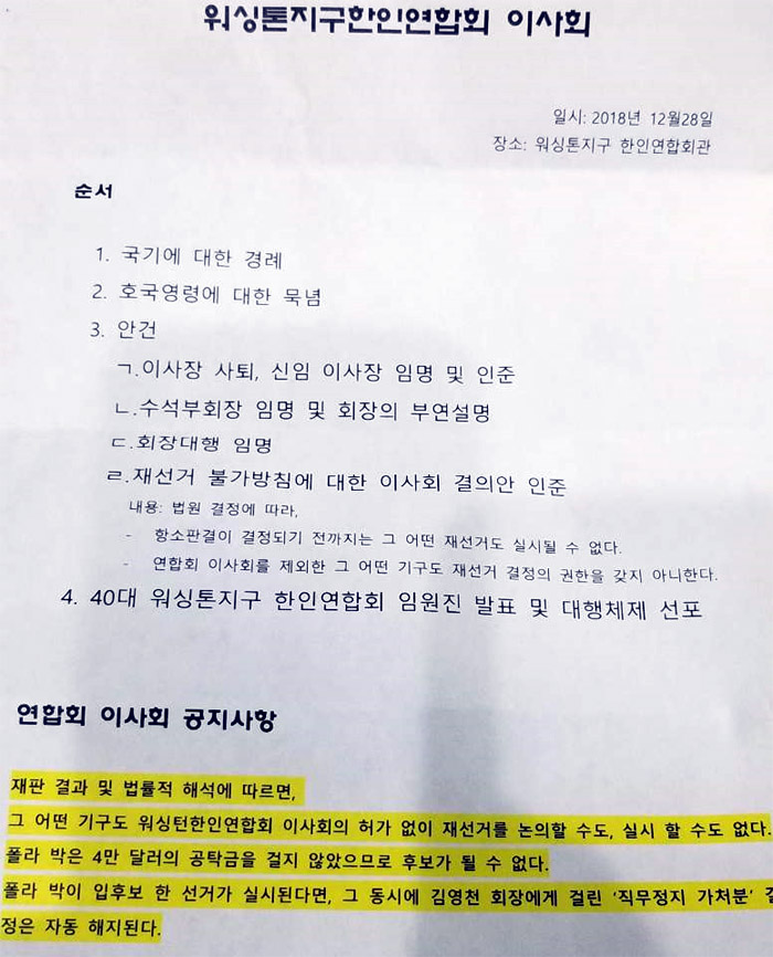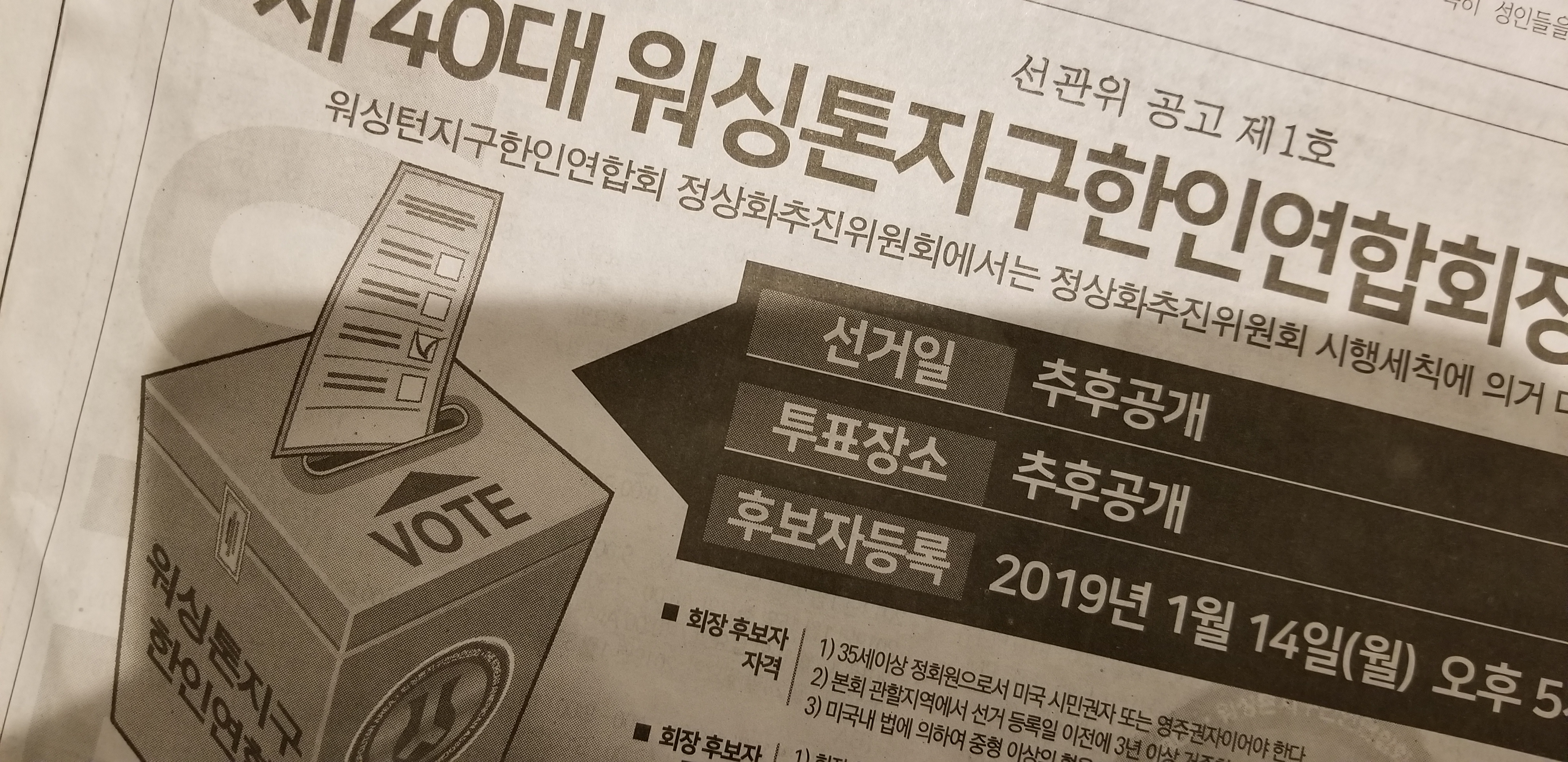 최민한 선관위원장을 비롯하여 선거관리위원인 정성낙,김상구,메건 손 등 세사람의 이름으로한 ‘선관위 공고 제1호’ 광고의 주요 내용은 ⊙후보자 등록 마감일은 2019년 1월 14일(월) 오후 5시까지 ⊙회장 등록금 4만 달러의 Cashiers Check or Money Order ⊙ Pay to KAAWMA (대문자) ⊙ 등록처는 워싱톤지구한인연합회 선관위 사무실(현 한인회관) 등이다.