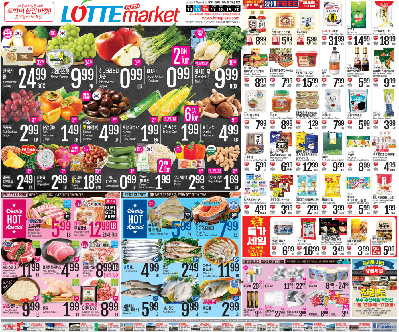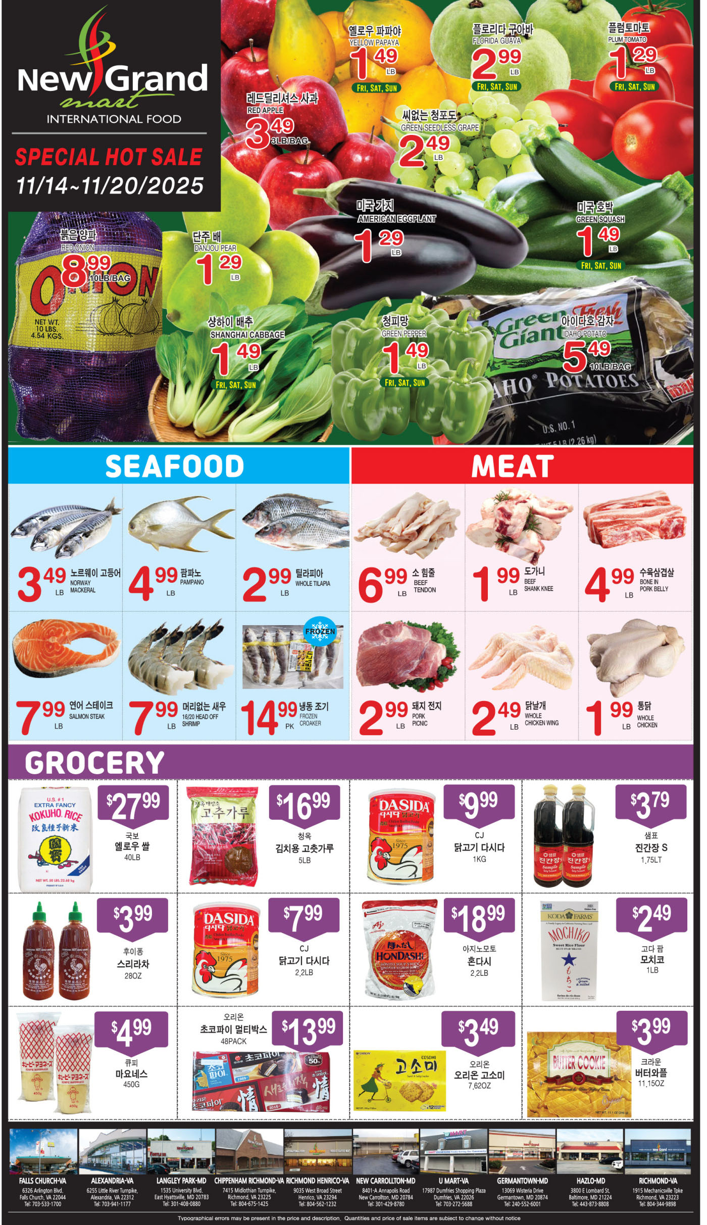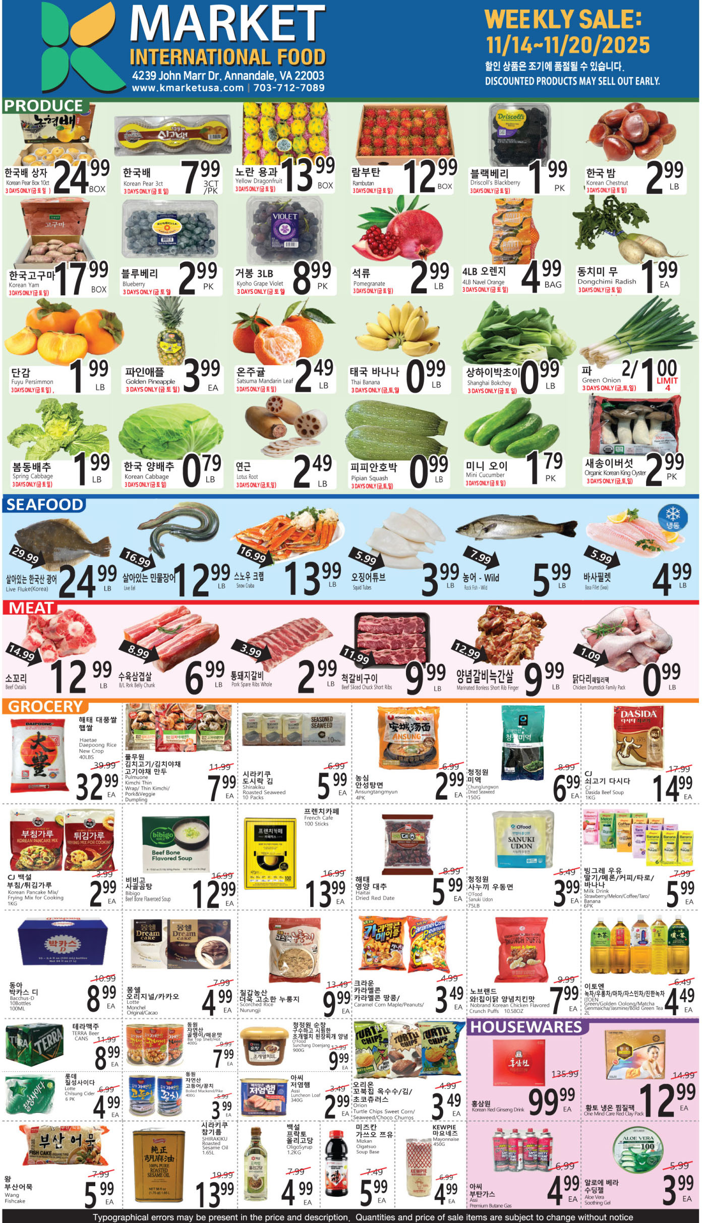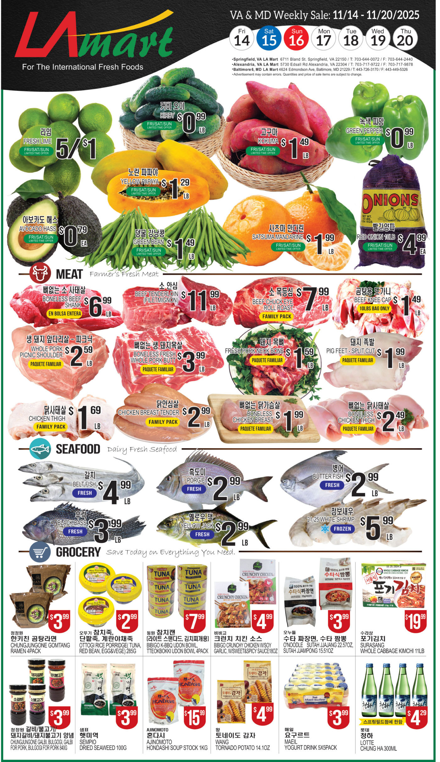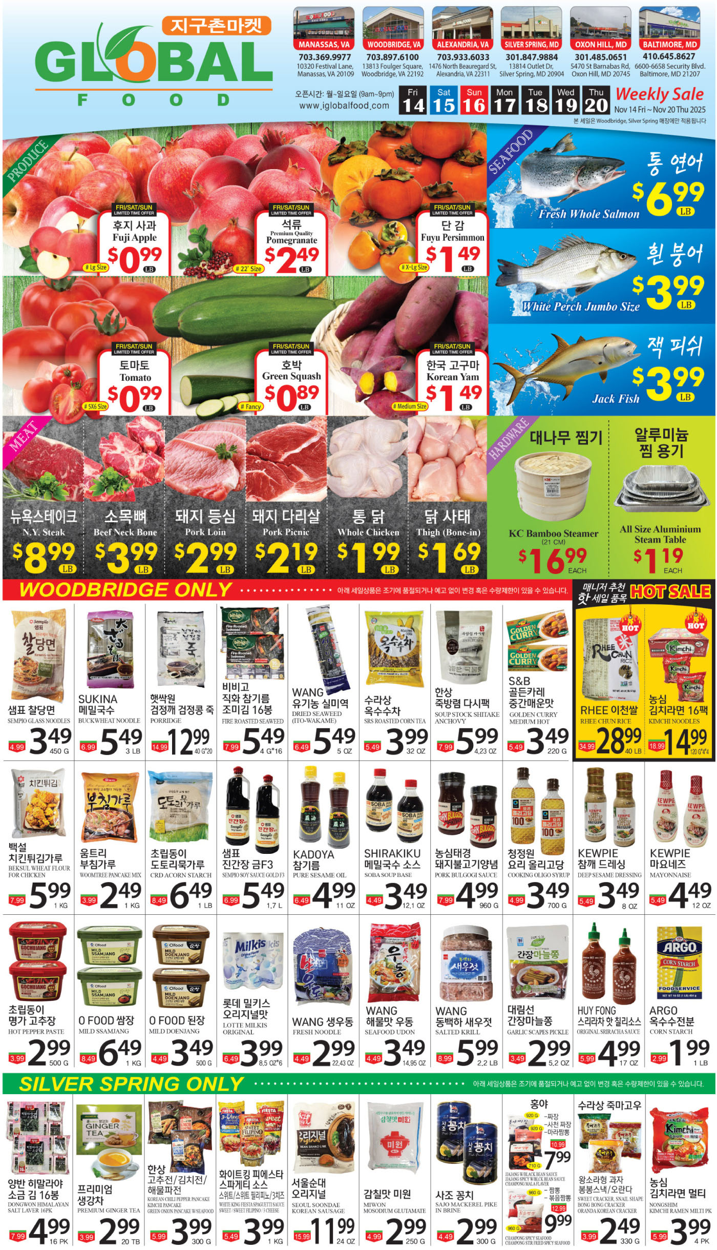 이번 주(11/14~11/20) 버지니아·메릴랜드 주요 한인마트 전단을 비교한 결과, 품목별 최저가가 마트마다 뚜렷하게 갈렸다. 과일·채소는 K-Market과 Global Food가 강세다. K-Market은 한국배(24.99), 단감(1.99), 블랙베리(1.99) 등 박스·한국식 채소 특가가 돋보이고, Global Food는 후지사과(0.99), 토마토(0.99), Green Squash(0.89) 등 채소류 전체가 최저가 수준이다. LA Mart는 가격은 평균적이지만 케빈오이(0.99), 고구마(1.49) 등 균형 잡힌 구성을 보였다.