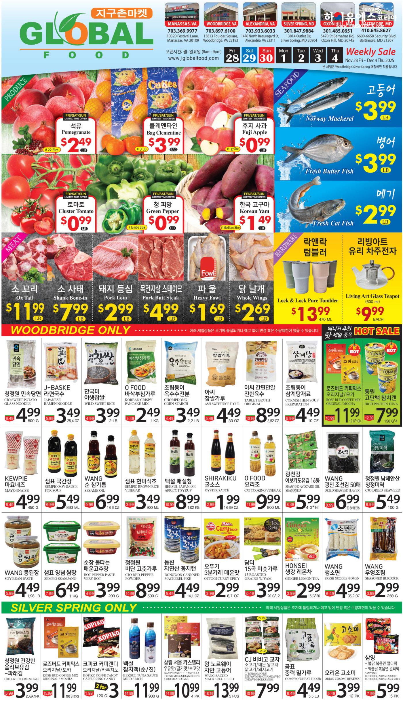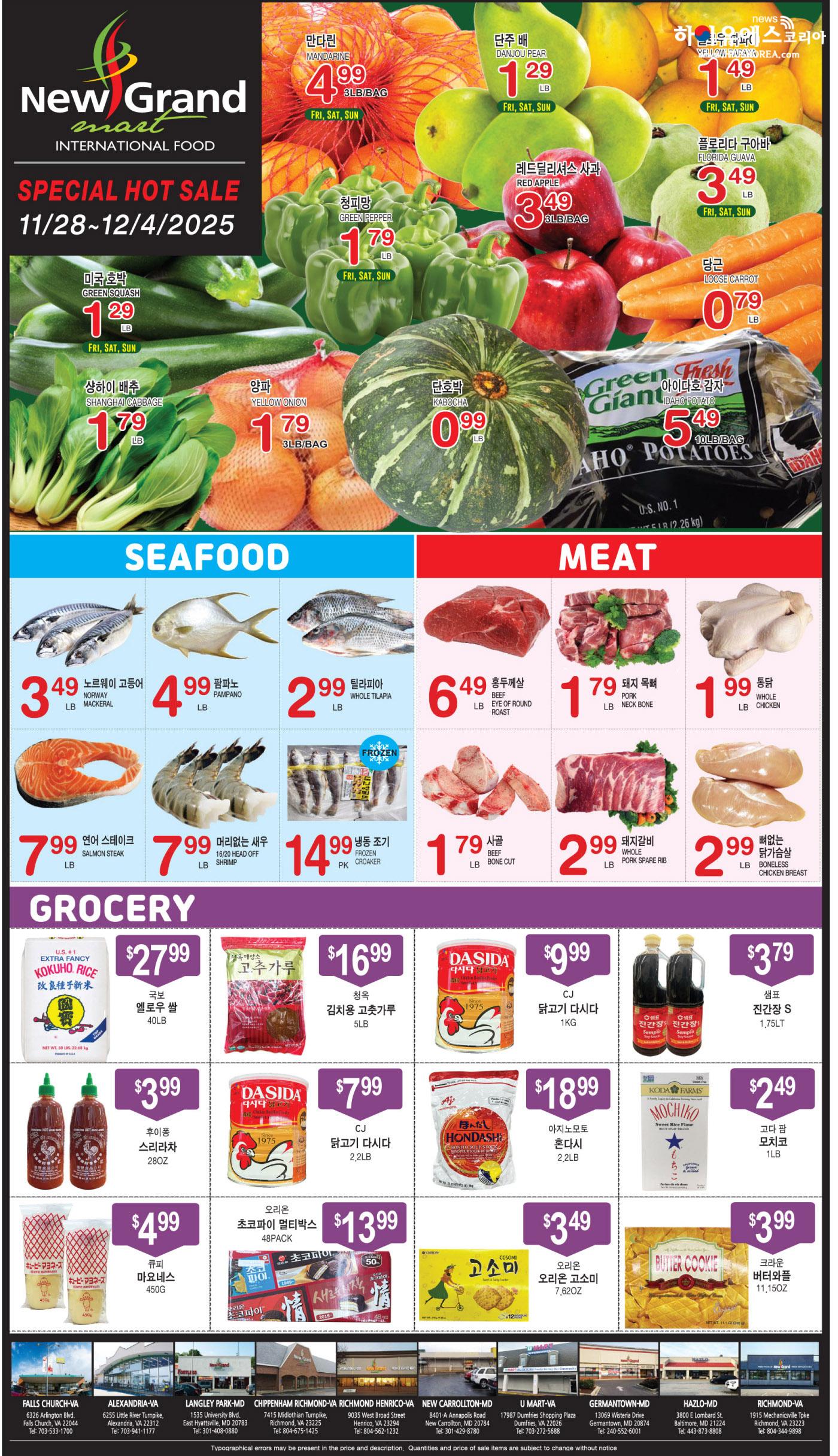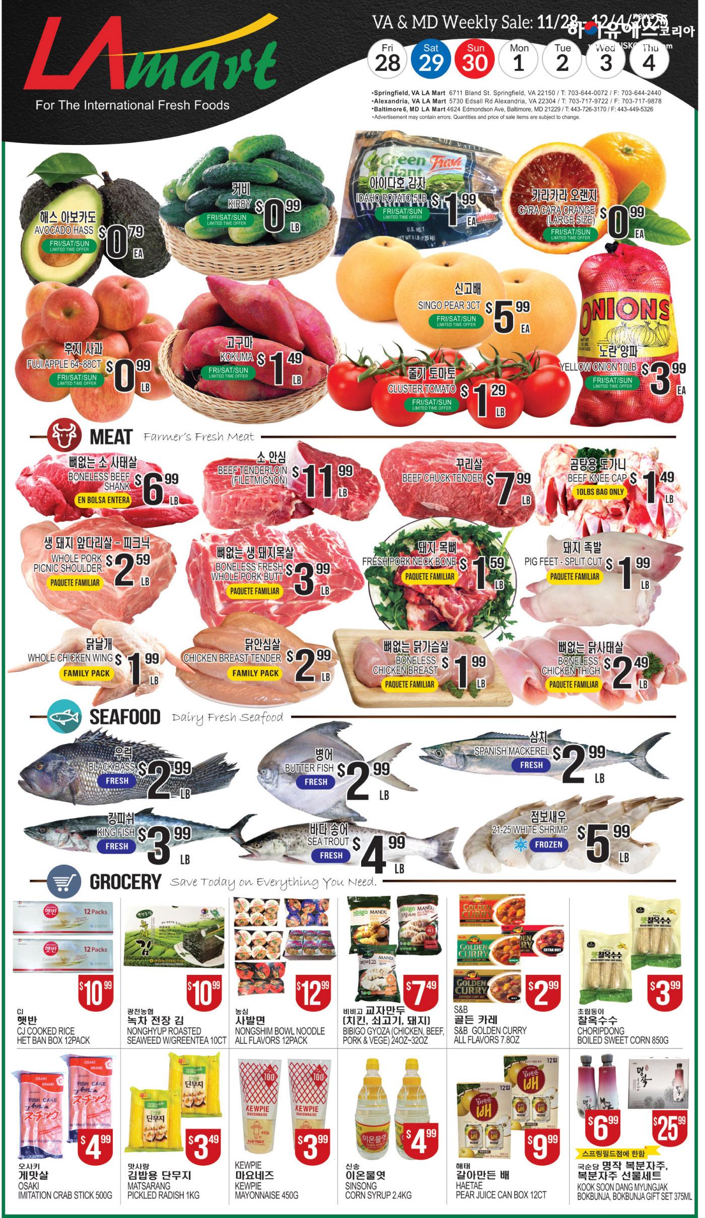 수산: 고등어 3.49, 틸라피아 2.99, 연어스테이크 7.99, 대하 7.99
