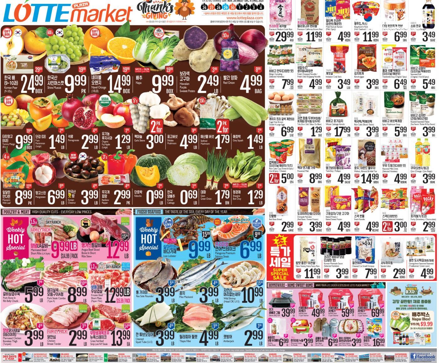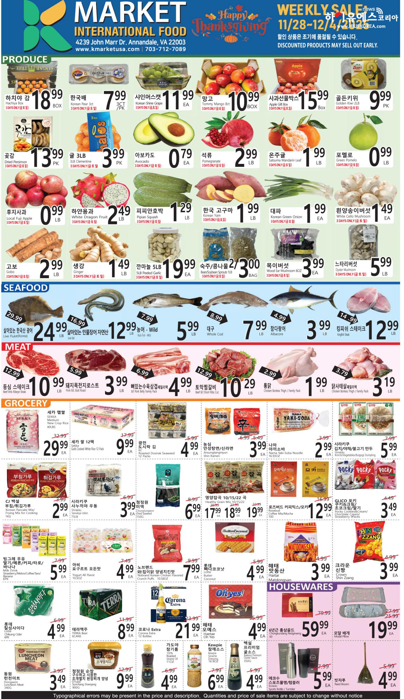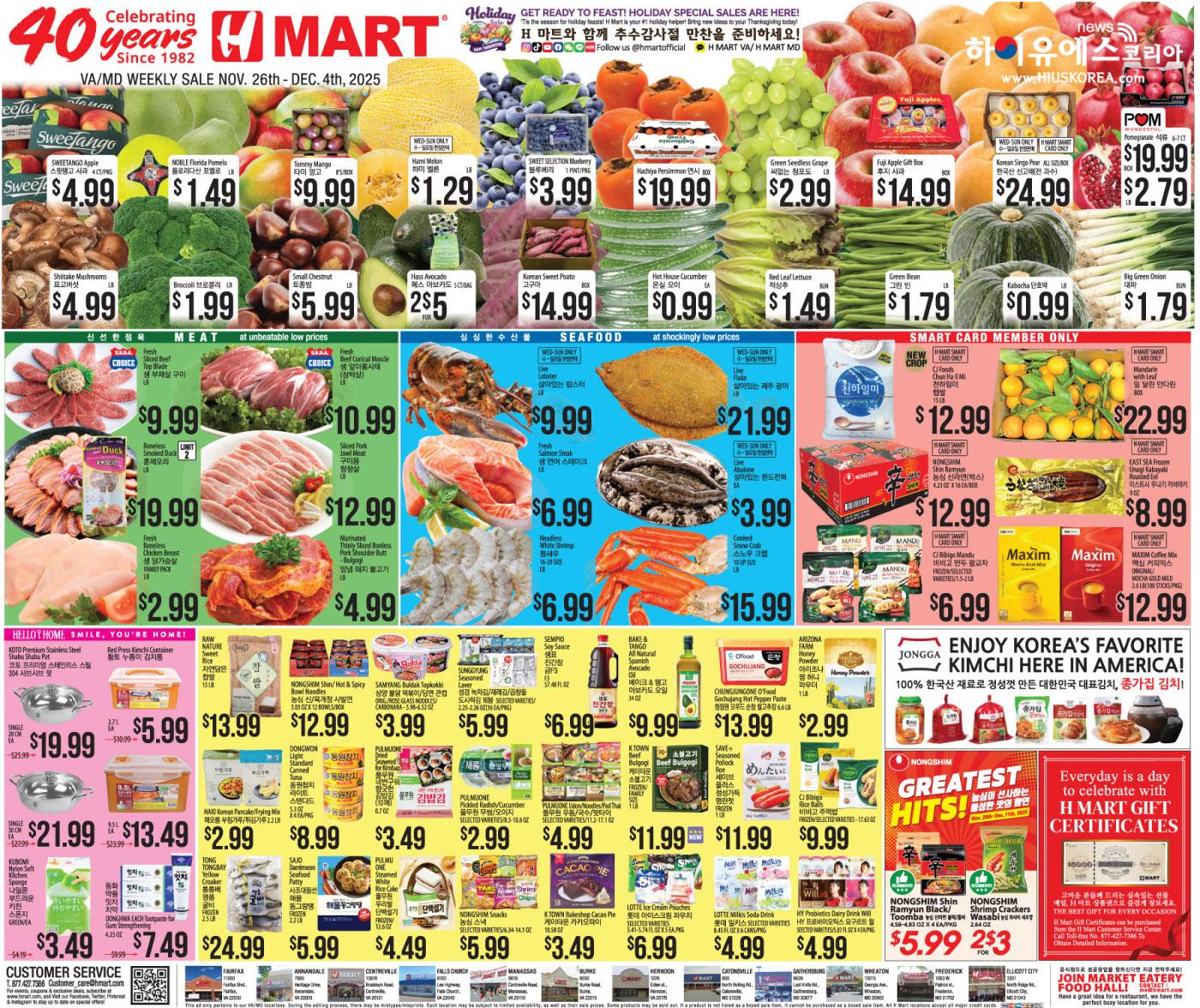 수산: 고등어 3.49, 틸라피아 2.99, 연어스테이크 7.99, 대하 7.99