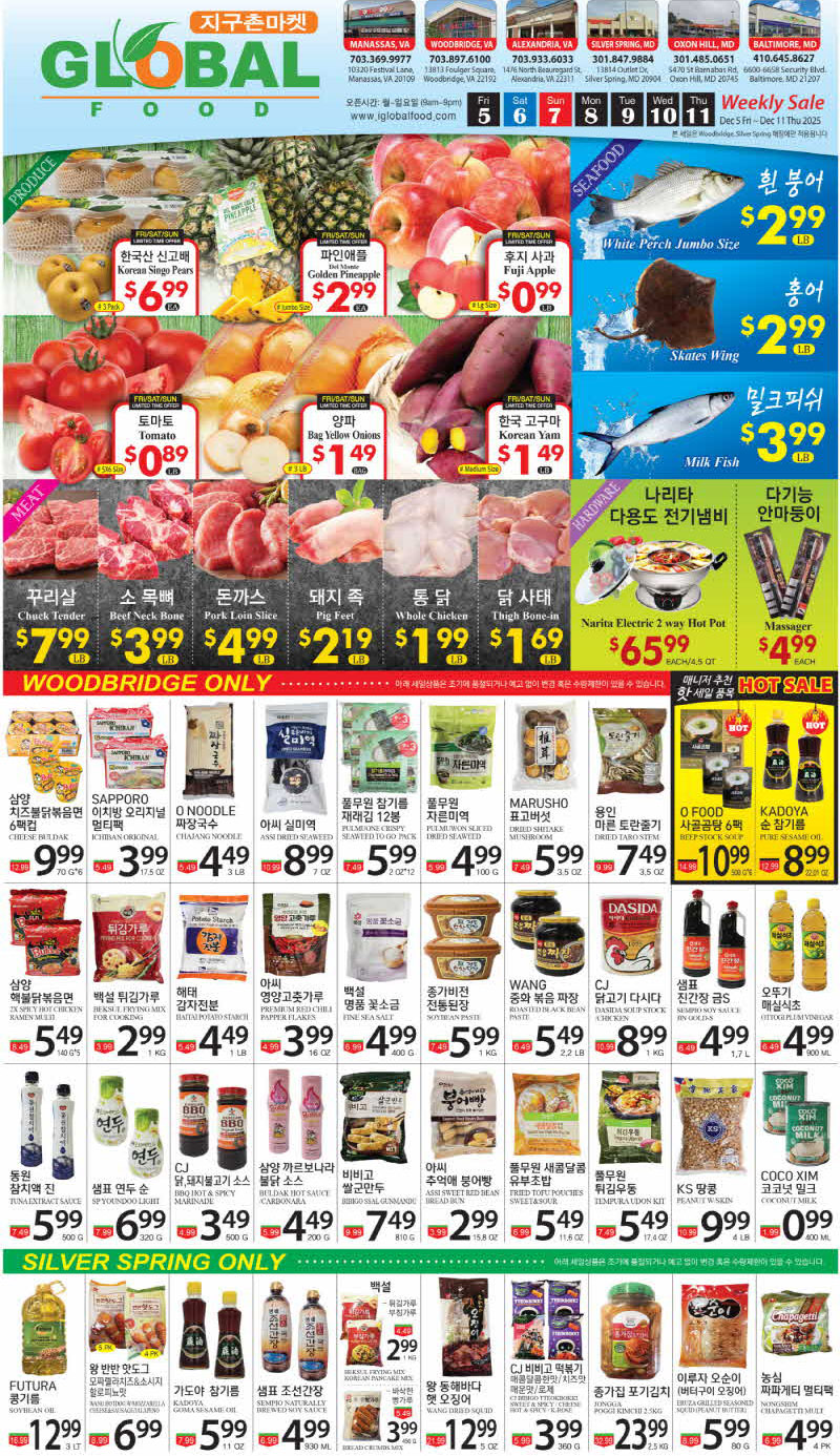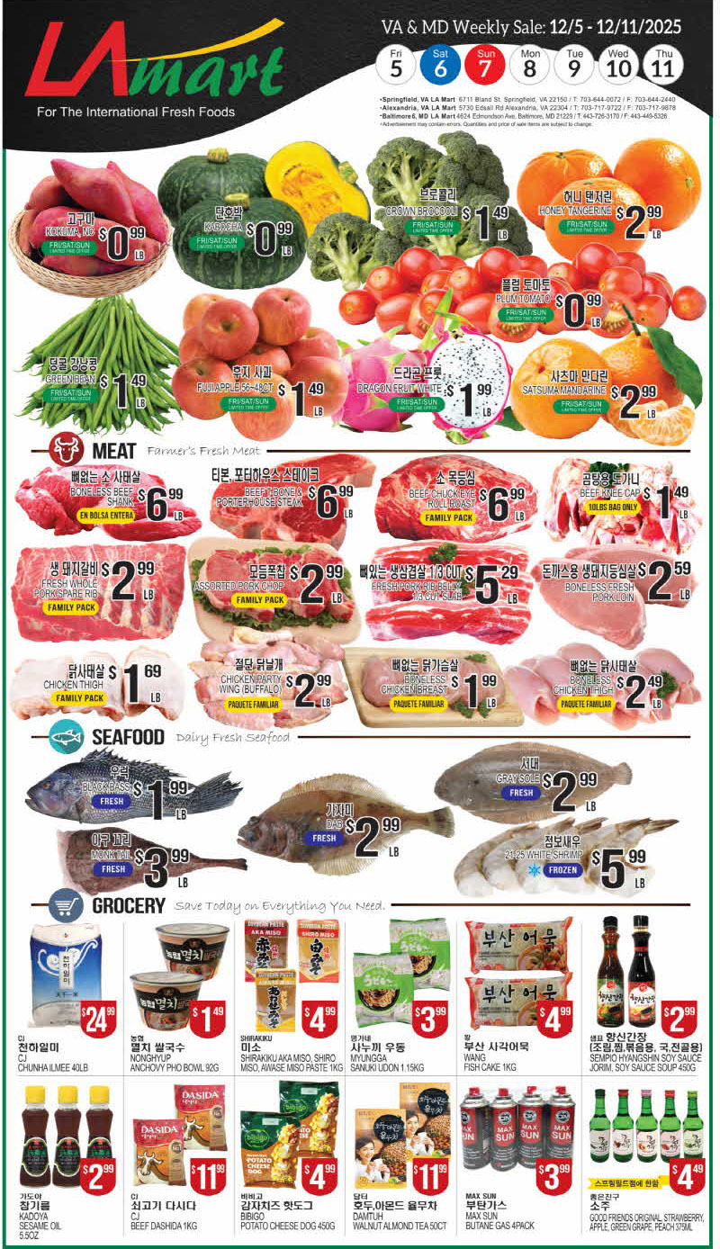 신고배 6.99(5입), 파인애플 2.99, 후지사과 0.99/lb, 한국고구마 1.49/lb, 꾸리살 7.99/lb, 목뼈 3.99/lb, 돈까스 4.99/lb, 닭다리 1.69/lb, 흰농어 2.99/lb, 홍어 2.99/lb
