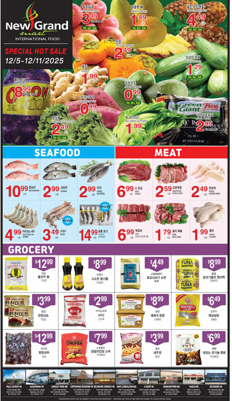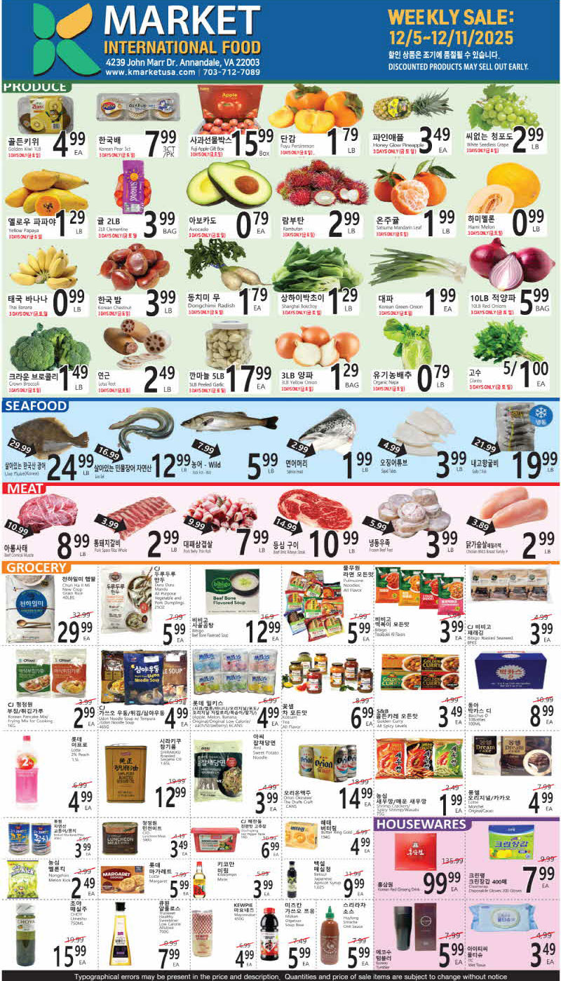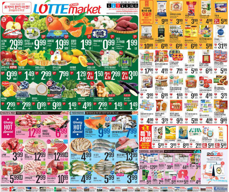 후지사과 3.49(3lb), 단감 2.49/lb, 생강 1.99/lb, 아보카도 0.99, 소등심 6.99/lb, 돼지목살 2.59/lb, 닭날개 2.99/lb, 홍도미 10.99/lb, 크로커 2.99/lb, 조기 14.99