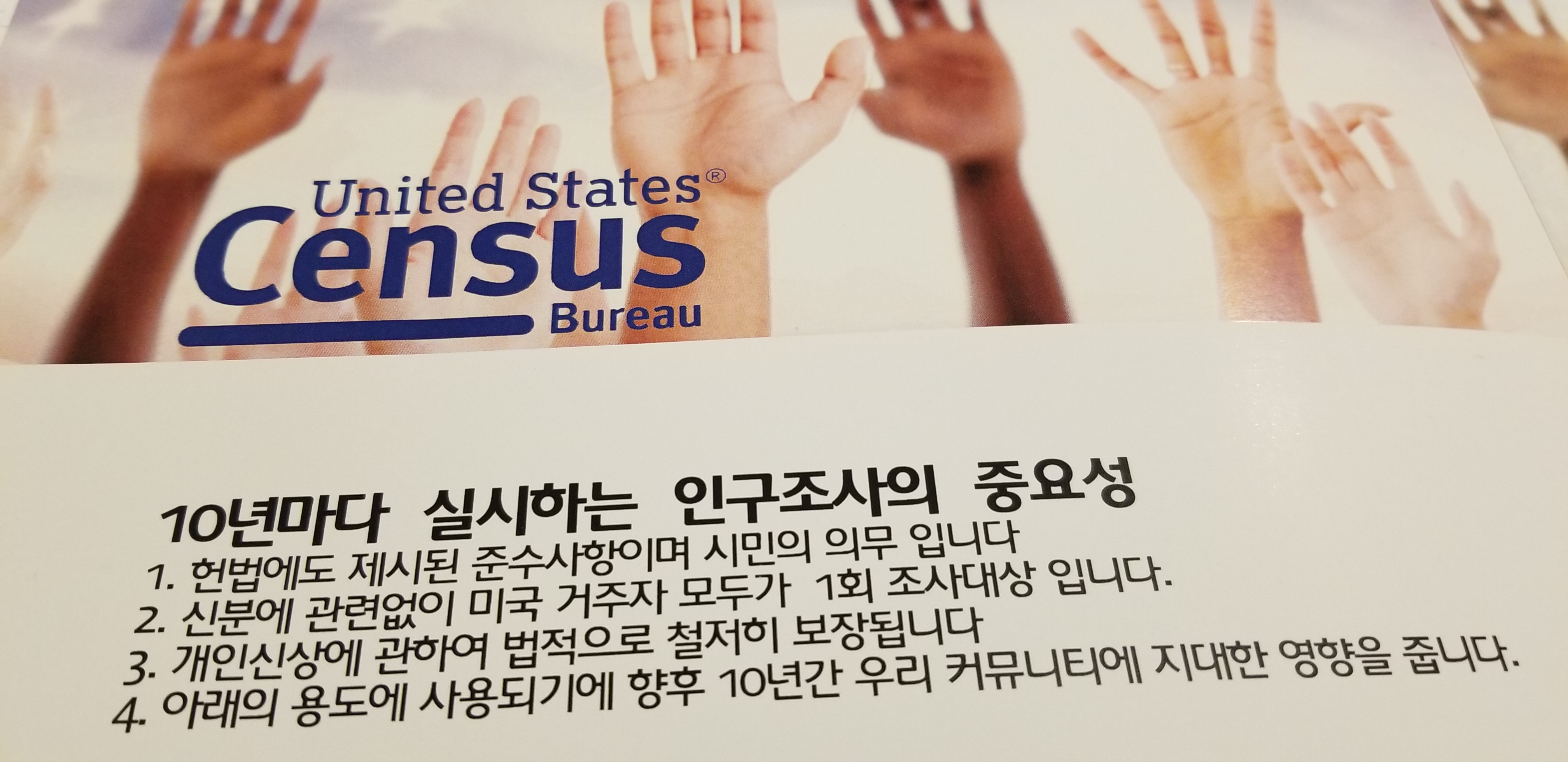 ‘2020 Census’, 즉 ‘2020 인구조사’는 미 인구조사국에서 10년마다 시행하는 인구 주택 총조사 프로젝트이며 미국에 거주하는 모든 사람들을 정확히 집계하는 것을 목표로 삼고있다. 정확한 인구 조사를 위해, 인구 조사원들은 정해진 주소들을 방문하여 가족 구성원 및 개인 소득 등을 조사하게 된다. 이번 설명회에는 총 8명이 참석하였으며, 이미 센서스에 지원을 하신 분들이 담당자를 만나서 본인의 지원 과정을 확인하고 이후의 절차에 대한 안내를 받을 수 있는 기회도 제공되었다.