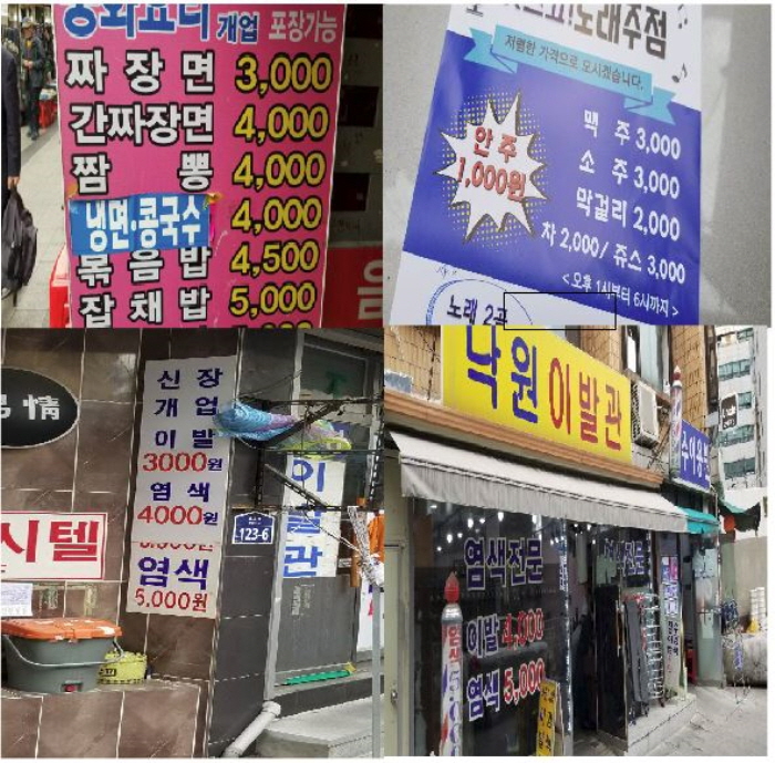 전국적으로 거의 모든 식당들이 손님이 없다고 아우성이지만, 이곳 식당들은 문전성시를 이루고 있었다. 바로 싸고 맛있기 때문이다. 노인들이 찾는 곳이라 노인 관련 업소는 무엇이든 저렴하지만 특히 음식값은 웬만하면 4~5천 원 수준의 그야말로 착한 가격이다. 짜장면이 3천 원, 국밥이 4천 원 수준이었다. ‘한끼식사 2,500원’이라는 일반음식점 간판도 걸려있다. 이 가격도 부담이 가는 노인들을 위해 종교 단체에서 ‘무료 급식소’도 운영하고 있다. 이 동네에서는 무엇이든 싸지 않으면 손님의 발길은 끓어진다고 보면 된다. 이발소에서는 이발 3천 원, 염색 4천원을 받고 있는데, 무료 커피도 제공하고 있었다. 염색 가격이 이곳 워싱턴 지역보다 10배 가까이 싸 재미 삼아 이곳에서 이발하고 염색까지 하고 갈까는 생각이 들었지만 대기하는 사람들이 너무 많아 포기했다.