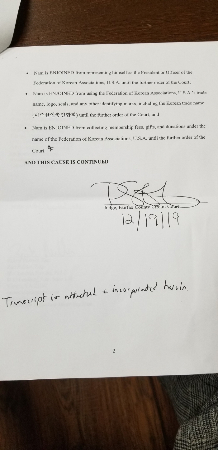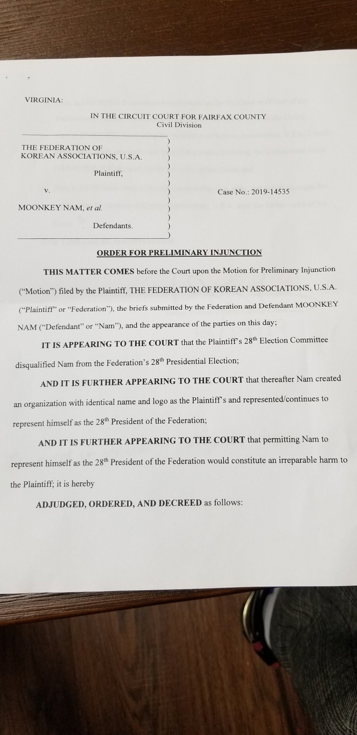 제28대 미주총연 분열에 관한 재판이 진행중인 가운데 박균희 회장 측에서는 챕 피터슨 담당 변호사와 함께 오늘(19일) 버지니아 비엔나에 소재한 우래옥 식당에서 기자회견을 갖고, 이날 오전 10시 버지니아 페어팩스 지방법원에서 있었던 결과를 설명했다. 본보에서는 아직 크로스 체크가 되지 않은 상황에서 일단 양측 변호사가 제공한 서류만 1차 보도하니 참고하기 바란다.