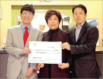 차기 하원드카운티한인회 장현주 회장(가운데)이 김상태 위원장(왼쪽)과 박수철 간사(오른쪽)에게 1,000달러를 기부하고 있다.