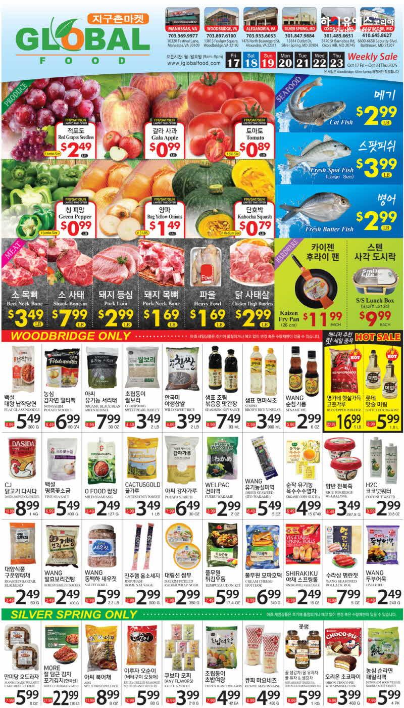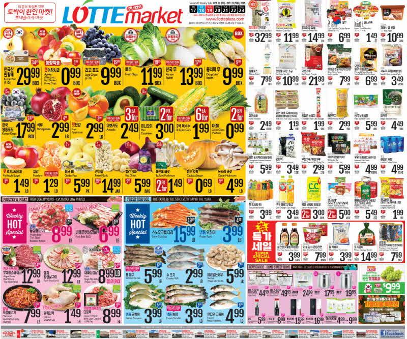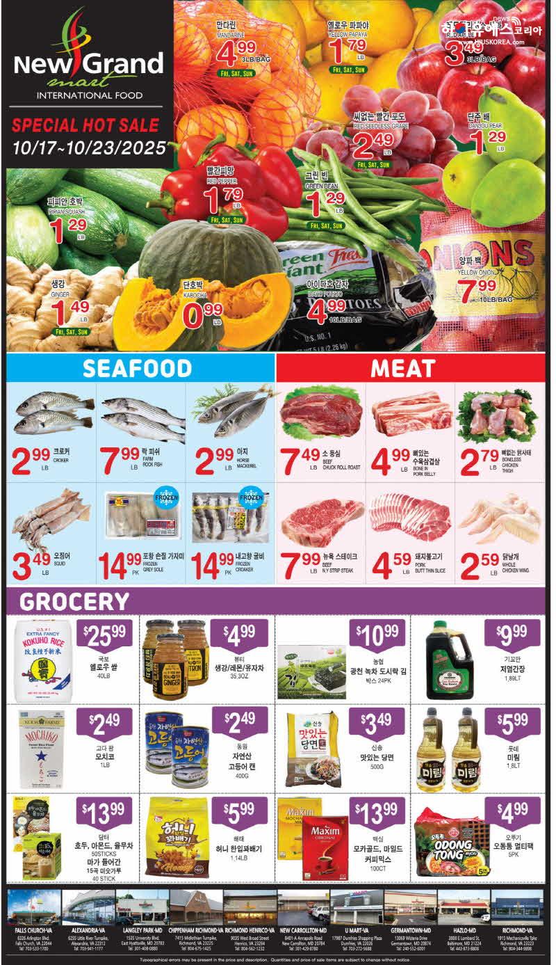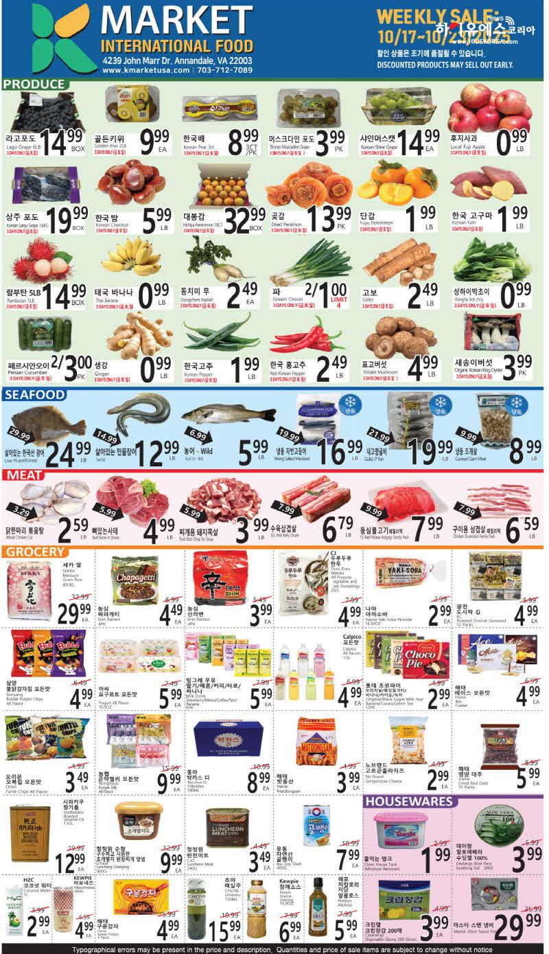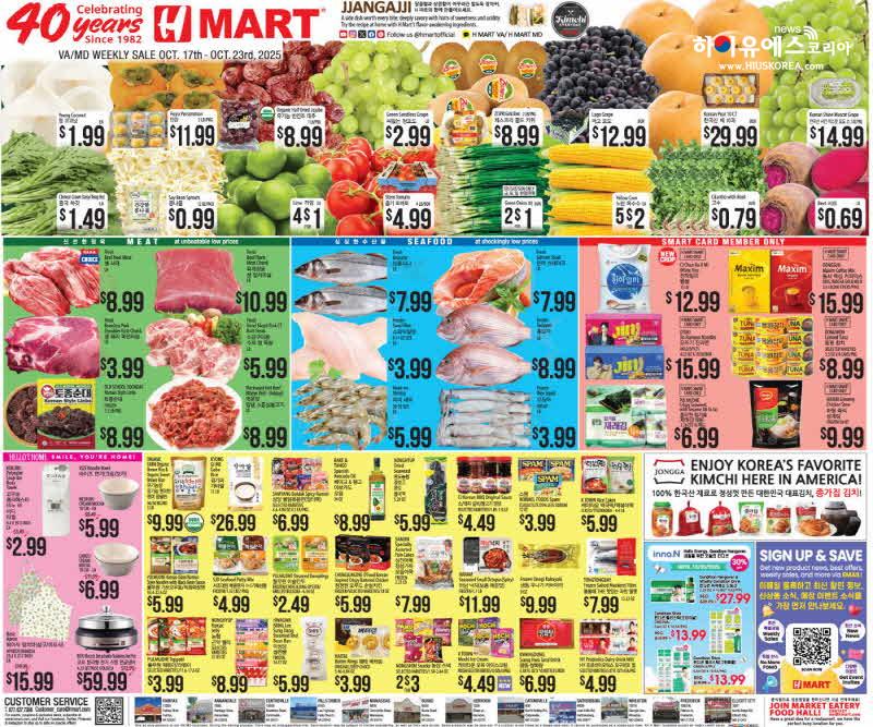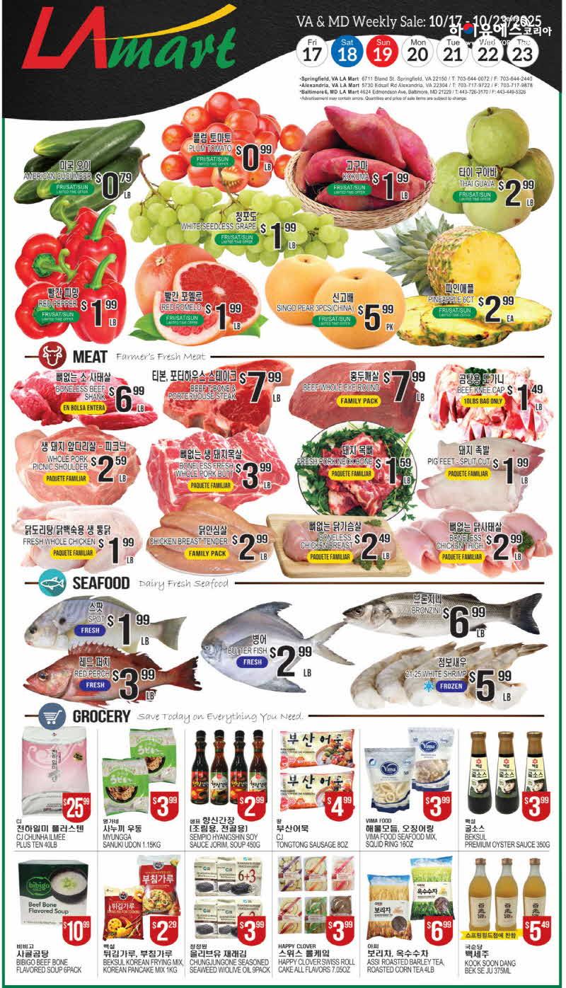 LA갈비 $8.99/LB, 삼겹살 $6.99/LB, 고등어 $3.99/LB, 조기 $5.99/LB