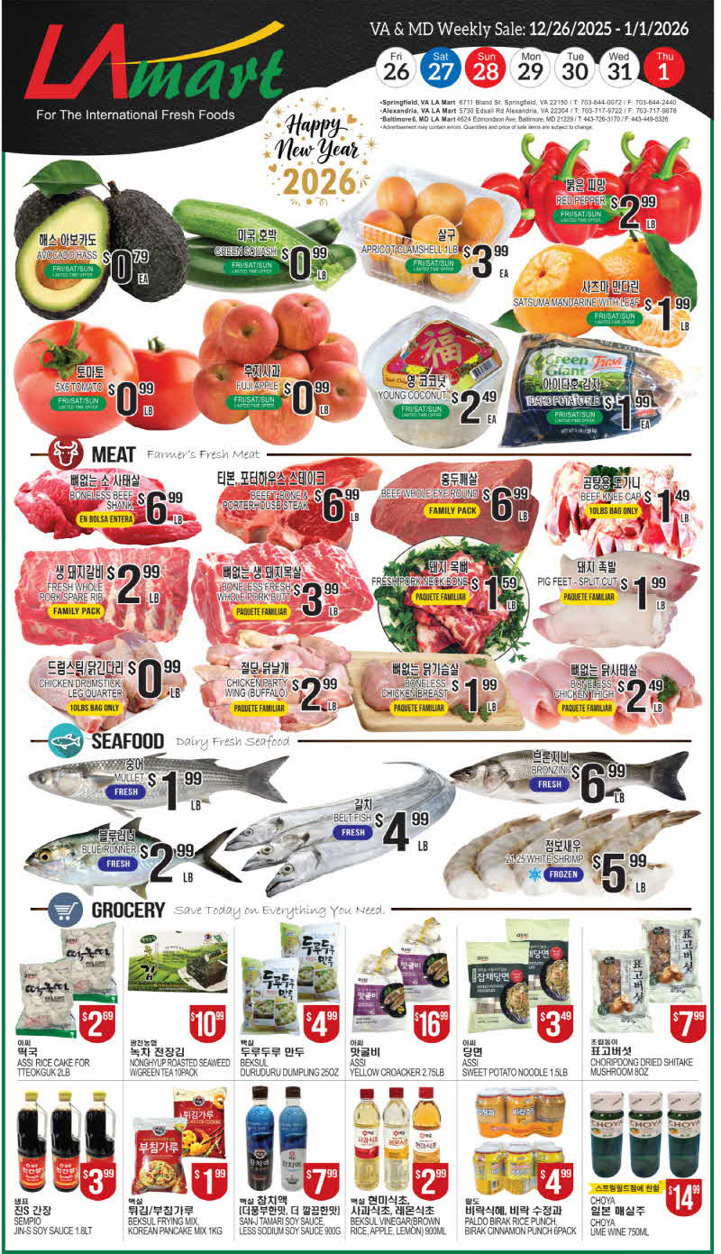 LA갈비 $12.99lb / 돼지등심 $2.99lb / 닭다리 $1.09lb