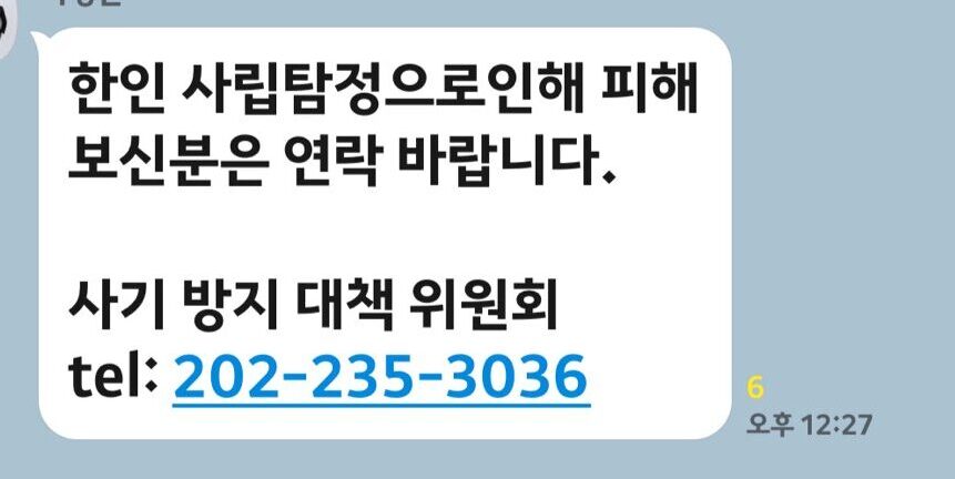 그런데 이 카톡은 지난 9월 24일 ‘미정의(가명)’이라는 이름으로 워싱턴 지역 모 한인회장이 운영하는 단체 카톡방에도 올라왔었다. 아마 어느 한인 사립 탐정이라는 사람으로부터 뜻하지 않은 피해를 당했고 또 다른 유사 피해자들이 많았다는 소문을 듣고 피해자들을 취합하여 집단 소 제기를 하려는 것 같다.