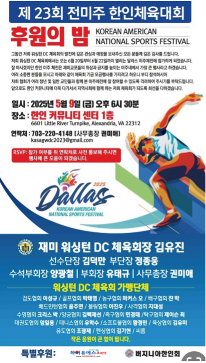 오는 6월 텍사스 달라스에서 열리는 제23회 전미주 한인체육대회를 앞두고, 워싱턴D.C. 체육회(회장 김유진)가 대회 준비와 선수단 후원을 위한 ‘후원의 밤’ 행사를 개최한다.