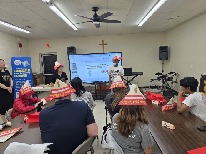 김명희 원장은 참가자들에게 한국의 전통 종이문화와 함께 분단된 한반도의 현실을 설명하고, 한반도의 평화통일을 기원하는 고깔모자 접기 체험을 진행했다. 학생들은 자신이 만든 고깔모자를 착용하고, 한국어로 자기 이름을 소개하며 큰 흥미를 보였다.