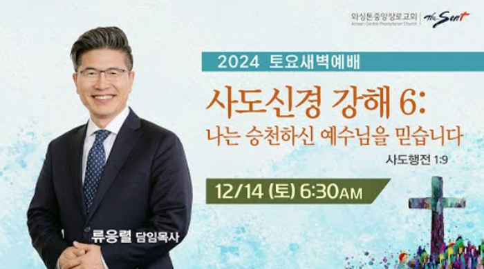 Featured워싱턴[와싱톤중앙장로교회설교]KCPC 토요새벽예배 설교 | 사도신경 강해 6: 나는 승천하신 예수님을 믿습니다 | 류응렬 담임목사 (12/14/2024) by 이태봉 기자2025-07-02 KCPC 토요새벽예배 설교 | 사도신경 강해 6: 나는 승천하신 예수님을 믿습니다 | 류응렬 담임목사 (12/14/2024) 하이유에스코리아편집국