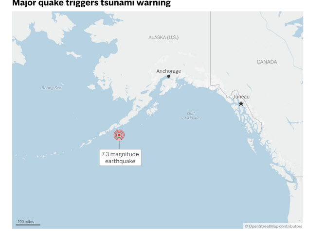 미국 알래스카주 남부 해안 약 1127킬로미터(km) 구간에 걸쳐 쓰나미 경보가 발령되면서 16일(현지시간) 주민들이 고지대로 대피하는 상황이 벌어졌다. 이날 샌드포인트 인근에서 발생한 규모 7.3의 강진에 따른 조치다.