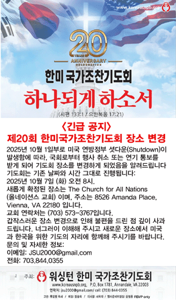 행사는 당초 계획대로 2025년 10월 7일(화) 오전 8시에 개최되며, 준비위원회는 갑작스러운 장소 변경으로 인한 불편에 대해 사과의 뜻을 전했다. 준비위원회는 “예상치 못한 상황이었지만 기도회의 의미와 목적은 변함없다”며 “동포 여러분이 새로운 장소에 함께 모여 미국과 한국을 위한 기도에 동참해 주시기를 바란다”고 당부했다.