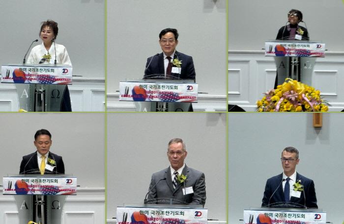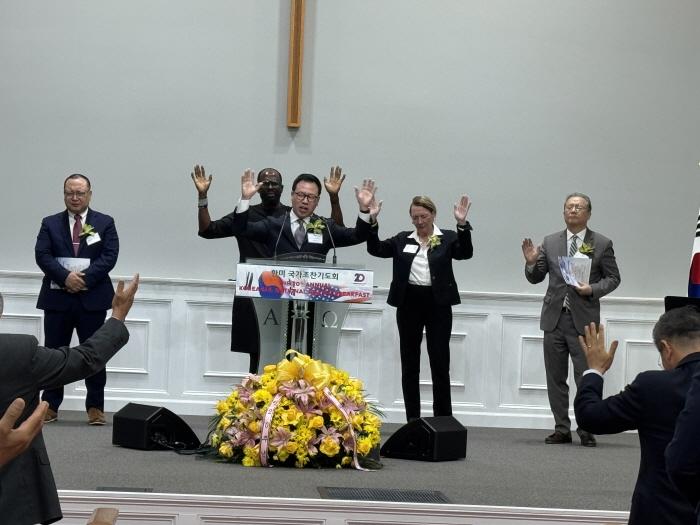 워싱턴한미국가조찬기도회(회장 정승욱, 이사장 서옥자)가 10월 7일(화) 오전 8시, 버지니아 비엔나 소재 올네이션스교회에서 은혜 가운데 열렸다. 이번 기도회는 원래 국회에서 열릴 예정이었으나, 연방정부 셧다운으로 인해 급히 장소가 변경되었음에도 불구하고 예정된 모든 참석자들이 함께해 성황을 이뤘다.
