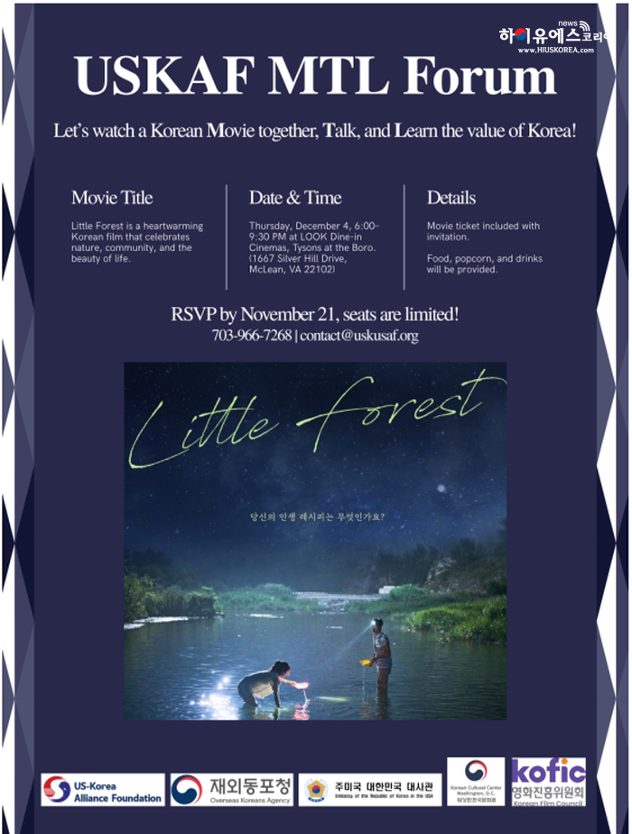 이번 포럼은 주미대한민국대사관, 재외동포청, 영화진흥위원회의 후원으로 워싱턴 한국문화원과 재단이 공동 주최하며, 상영 작품으로는 임순례 감독, 김태리 주연의 힐링 영화 **‘리틀 포레스트’**가 선정됐다.