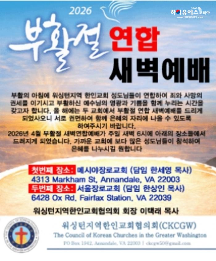 워싱턴지역한인교회협의회(회장 이택래 목사)는 2026년 부활절을 맞아 지역 한인교회 성도들이 함께하는 ‘부활절 연합 새벽예배’를 개최한다.