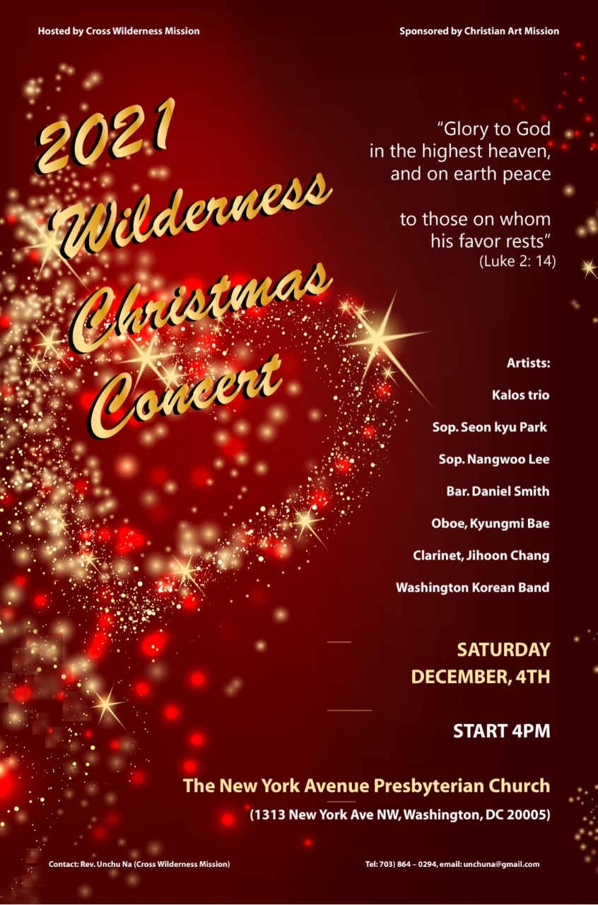 워싱톤 코리안 밴드(이종관 목사)와 Kalos Trio(고은애 교수), 그 외 다수 음악인들이 펼치는 수준높은 연주와 찬양으로 ‘아기 예수를 높이고’ 가난하고 어려움에 처한 이웃들에게 위로와 희망의 선물이 되기를 소원하며 준비하는 “홈리스와 함께하는 크리스마스 음악회”이다.