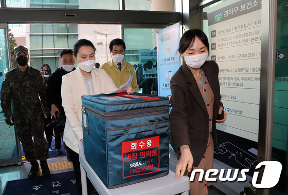 <사진> 신종 코로나바이러스 감염증(코로나19) 백신 유통 제2차 범정부 통합 모의훈련이 열린 지난 19일 오후 서울 관악구보건소에서 관계자들이 아스트라제네카 백신을 들고 보관 장소로 이동하고 있다. 2021.2.19/뉴스1 © News1 이동해 기자