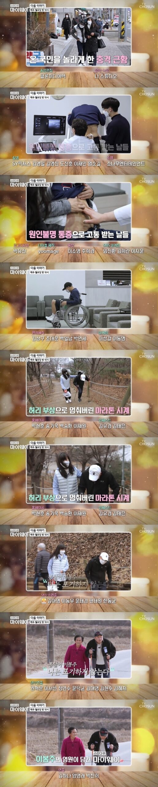 이날 예고편에서 이봉주는 굽은 등으로 아내에게 의지한 채 걷는가 하면, 휠체어를 타고 있는 모습을 보여줬다.