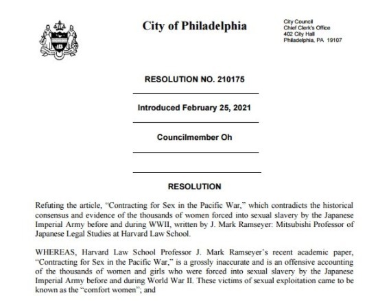 필라델피아 시의회는 결의안에서 미 연방하원을 포함, 주요국이 위안부 피해자를 지지하고 일본의 역사 부정에 반대하는 결의안을 채택했다는 사실을 소개했다. 또 이번 논문에 대해서도 하버드대 한인 학생회 등이 사과와 논문 철회 등을 요구했다고 알렸다.