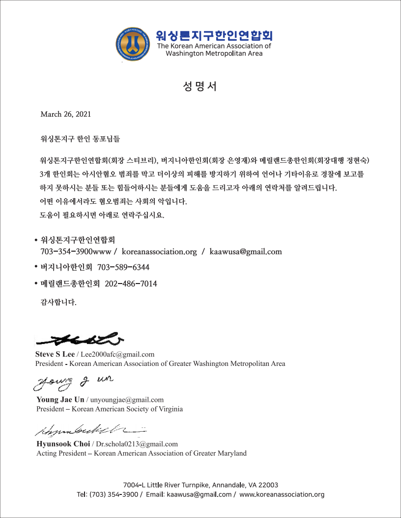 이에 워싱턴 지역 3개 한인회 (워싱턴한인연합회, 버지니아한인회, 메릴랜드총한인회)에서는 언어 문제와 신고 절차에 애로를 겪는 한인들을 위해 신고 핫라인과 이메일을 알리는 긴급 성명서를 27일 발표했다. (신고 연락처는 성명서를 참고하시기 바란다.)