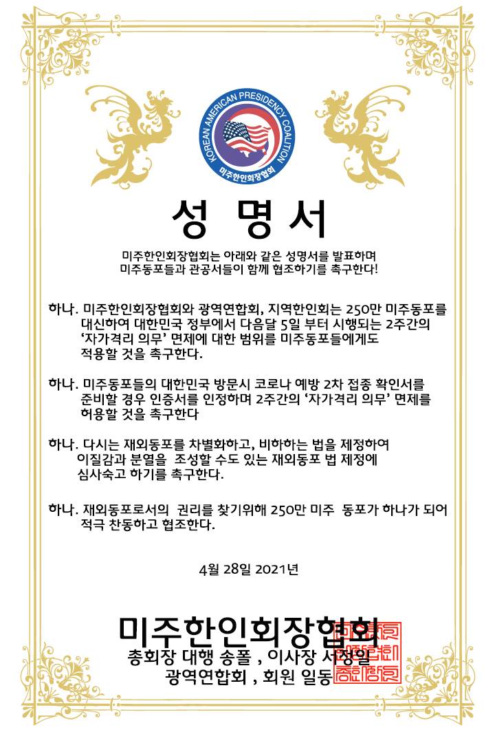 미주한인회장협회는 “250만 미주동포를 대신해 한국 정부에서 다음 달 5일부터 시행되는 2주간의 자가격리 의무 면제에 대한 범위를 미주동포들에게도 적용할 것을 촉구한다”는 성명서를 발표했다.