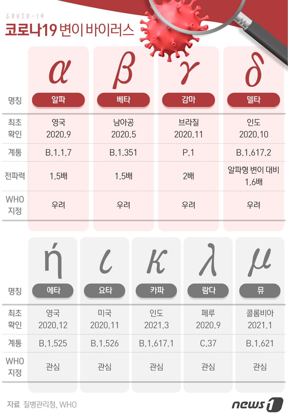 코로나19 백신의 면역 효과를 떨어뜨릴 수 있는 새로운 변이 ‘뮤'(Mu)가 세계보건기구(WHO) 관심변이(VOI) 목록에 지난달 30일 등재되면서 방역 당국이 긴장하고 있다.