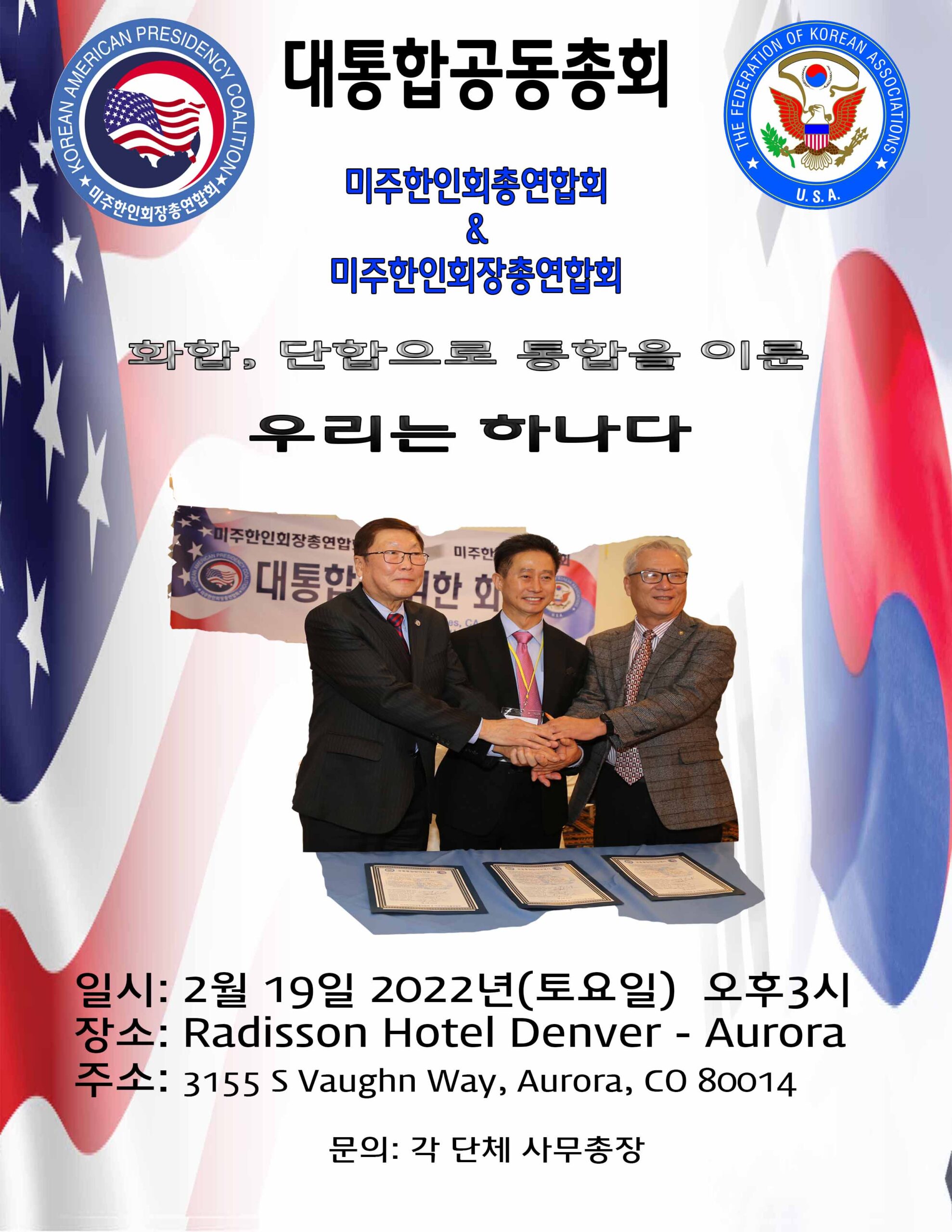 이제 대통합이라는 멈출 수 없는 열차는 출발했다. 시대적 소명인 그 열차가 목적지에 잘 도착할 수 있도록 우리 모두 힘을 합쳐 밝은 미래로 나아가자. 19일 덴버 총회장에 많은 회원들이 참석했으면 한다.