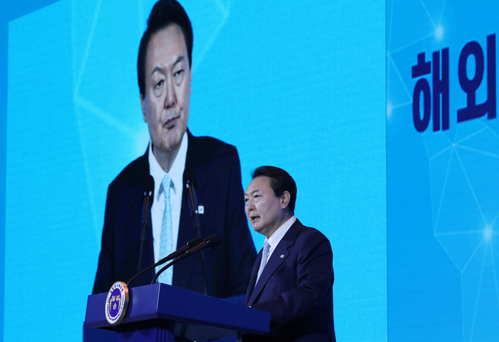 29일 서울 그랜드 워커힐 호텔에서 열린 ‘제20기 해외 지역회의’에서 윤석열 대통령은 ‘담대한 첫걸음, 통일로 한걸음’이라는 주제로 의장과의 ‘통일대화’를 주재했다.