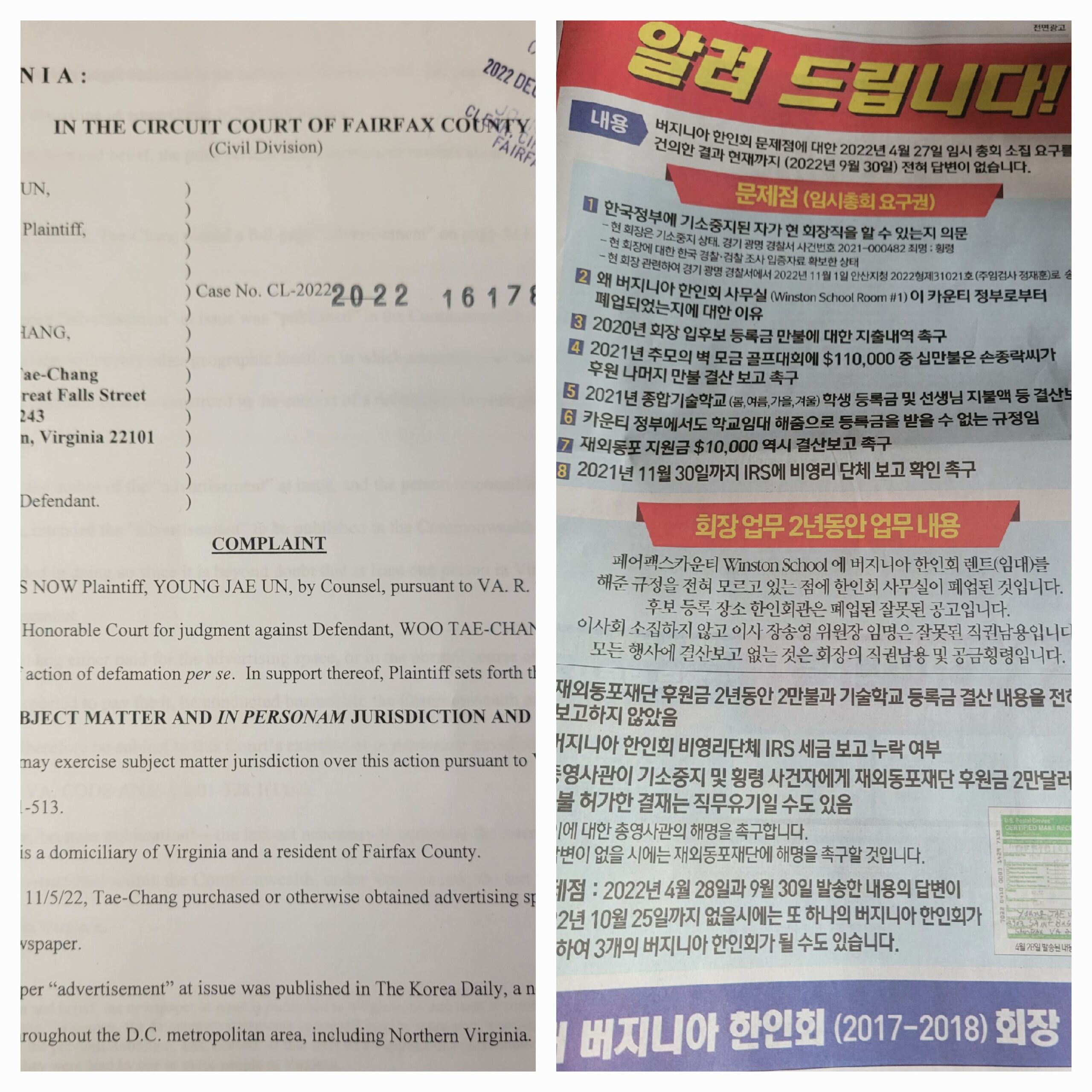 은영재 회장은 이 자리에서 페어팩스 순회법원에 접수한 50만 달러에 달하는 거액의 손해배상 소송장(Case No. CL-2022 16178)을 기자들 앞에 제시했다.
