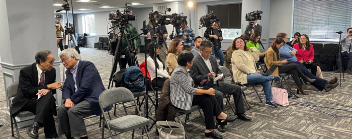 TJ고 뒷문에 위치해 있어 그런지 아니면 미 주류사회에서는 이미 아시아계 커뮤니티의 랜드마크가 되어서 인지 애난데일 한인타운 인근 알렉산드리아에 위치한 K-센터 2층 대강당에서 열린 기자회견 장에는 미 주류 언론들도 대거 취재하면서 북새통을 이루었다.