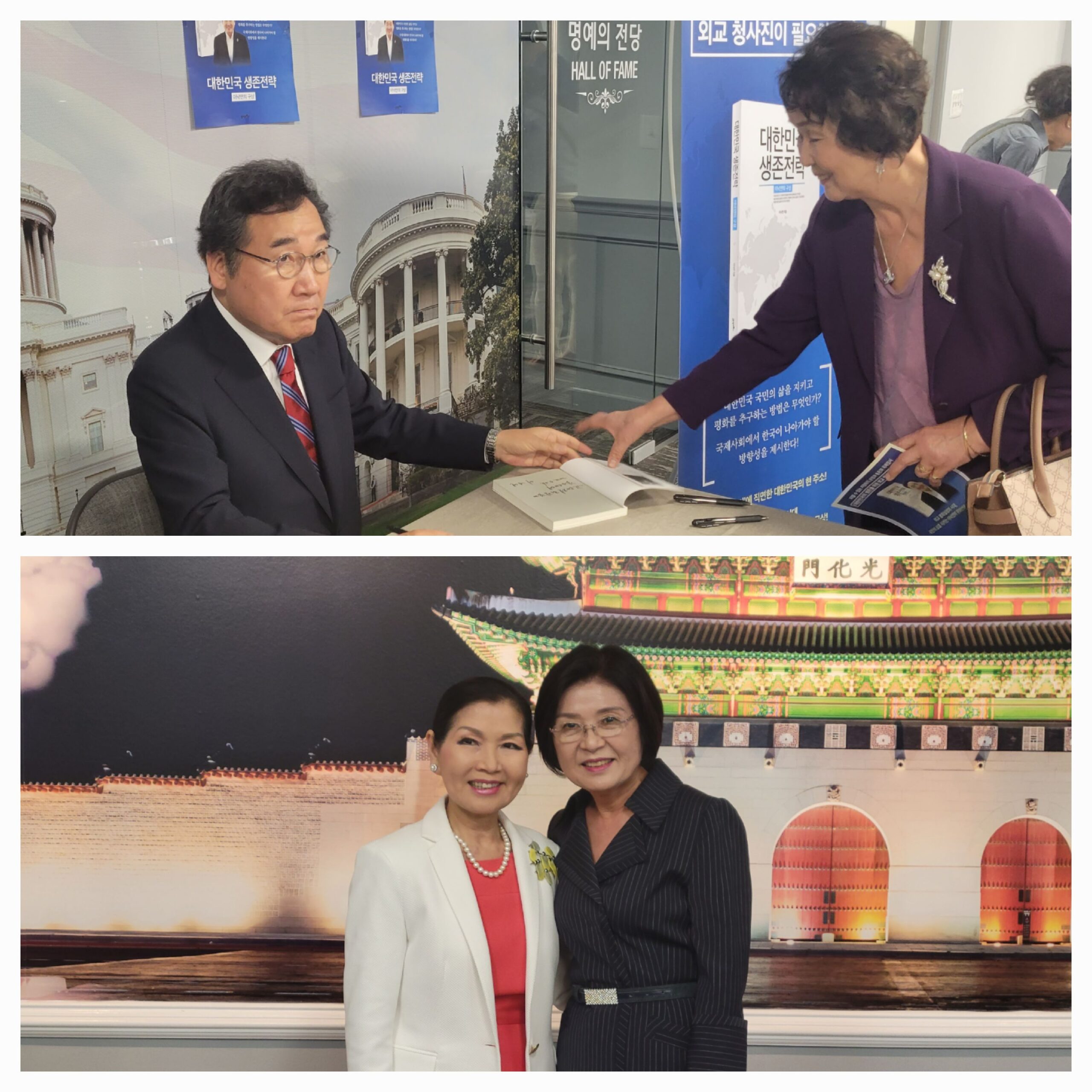 북사인회를 하고 있는 이낙연 전 총리(위)와 축하차 참석한 유미호건 여사와 김숙희 여사.