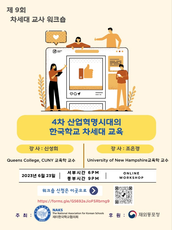 재미한국학교협의회(NAKS, 총회장 추성희)는 6월23일 금요일 오후 9시(동부시간), ‘4차 산업혁명시대의 한국학교 차세대 교육’이란 주제를 가지고 제9회 차세대 교사 워크숍을 온라인으로 개최한다.