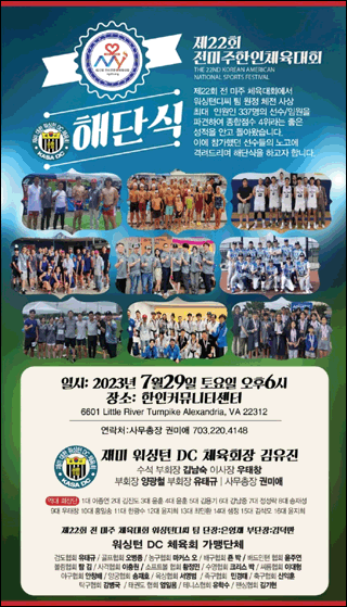 Featured워싱턴워싱턴대한체육회 선수단 해단식, “29일 코리안커뮤니티센터” by 강남중 기자2023-07-282023-07-28 제22회 뉴욕 미주체전에서 종합 4위라는 좋은 성적을 거두고 돌아온 워싱턴대한체육회(회장 김유진)에서 선수단 해단식을 개최한다. 김유진 회장은 “어려운 여건에서도 최선을 다한 선수단(단장 은영재, 부단장 김덕만)을 격려하고 노고를 치하하는 선수단 해단식을 거행하려 하니 참가 선수들의 많은 참석을 바란다”고 했다. 해단식은 29일(토) 오후 6시 ‘코리안커뮤니티센터’ 대강당에서 개최된다. 문의 권미애 사무총장 703-220+4148