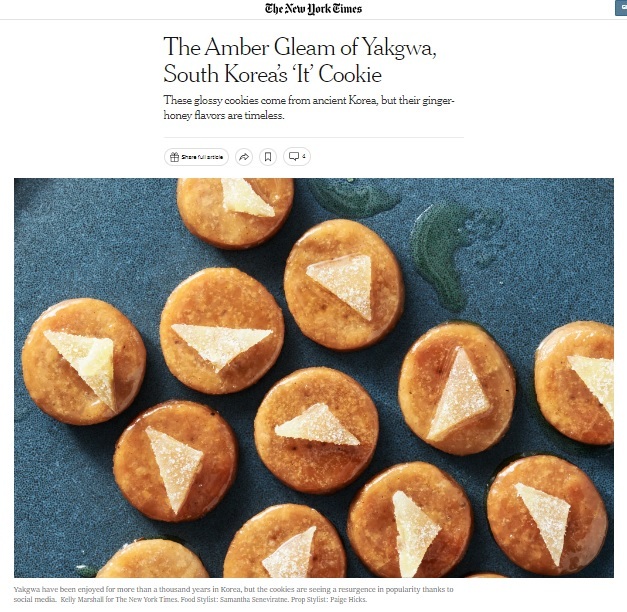 NYT는 이날 한국의 전통 디저트인 약과가 특히 최근 MZ세대(밀레니얼+Z세대)를 중심으로 다시 주목받고 있는 현상에 대해 비중 있게 다뤘다.