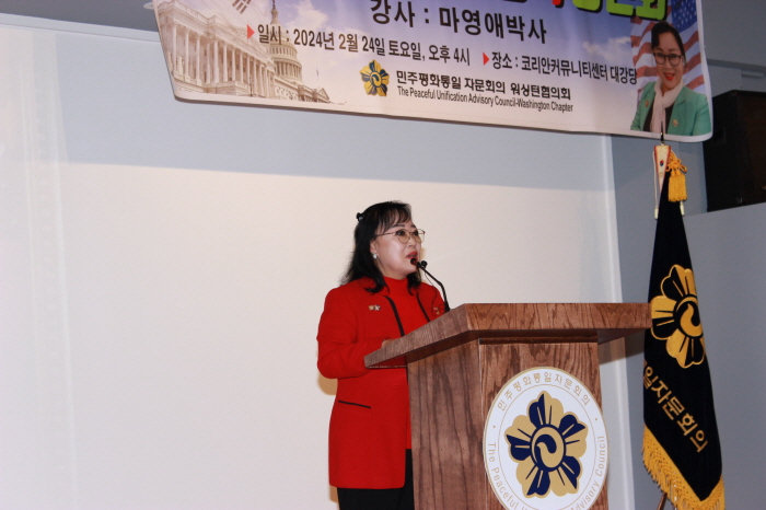 지난 2월24일 오후4시부터 알렉산드리아소재 코리안커뮤니티센터 1층 대강당에서 민주평화통일자문회의 워싱턴 협의회(회장 린다 한, 이하 워싱턴 평통)는 국제탈북민 인권연대 대표이자 민주평통 뉴욕상임위원인 마영애 박시를 초청하여 ‘북한인권과 통일정책’에 대한 강연회를 열었다.
