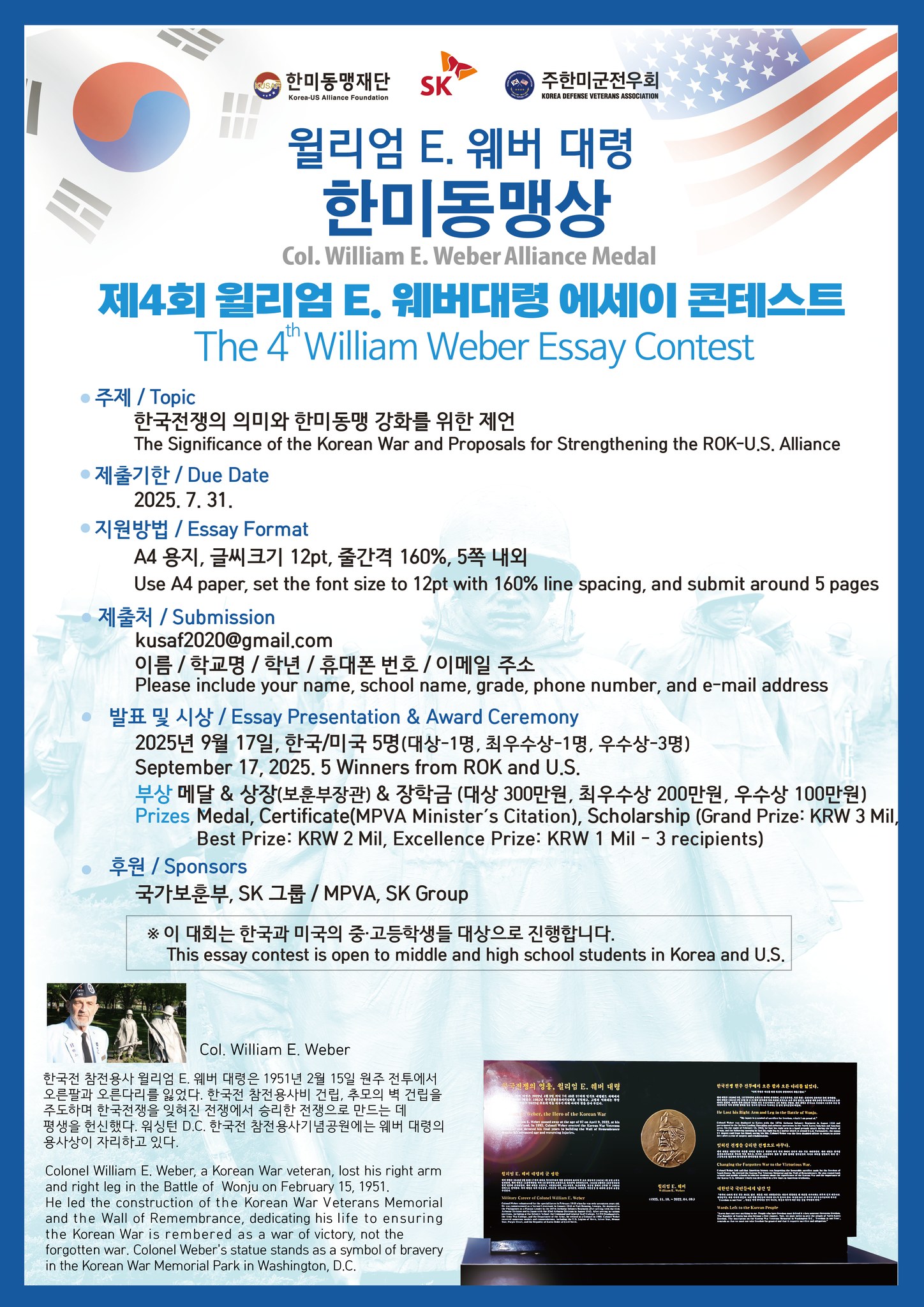 한미동맹재단 KUSAF (회장 임호영)과 주한미군전우회 KDVA (이사장 로버트  에이브럼스)가  2025년 제4회 ‘윌리엄 E. 웨버 대령 한미동맹상 에세이 콘테스트’를 개최한다. 이번 에세이 공모전은 한국전쟁의 의미를 되새기고 한미동맹 강화를 위한 창의적인 제안을 모색하기 위해 마련되었으며, 한국과 미국의 중·고등학생을 대상으로 진행된다.