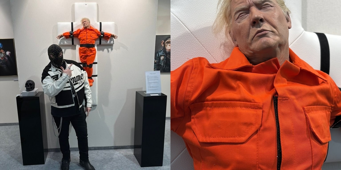 트럼프 미국 대통령이 주황색 죄수복을 입은 채 십자가에 매달린 모습을 표현한 설치미술 작품이 스위스 바젤역에 전시될 예정이었다가 취소됐다.