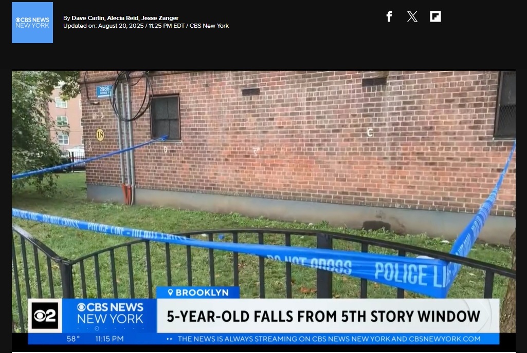 미국 CBS 뉴스에 따르면 지난 20일(현지시간) 정오쯤 뉴욕 브루클린의 아파트에서 사고가 발생했다. 바바(5)를 비롯한 아들 3명과 집에 있던 엄마 음발루 카마라는 바바가 장난감을 찾으러 침실에 들어갔다가 5층 창문 바깥으로 떨어졌다고 CBS 뉴스에 말했다.