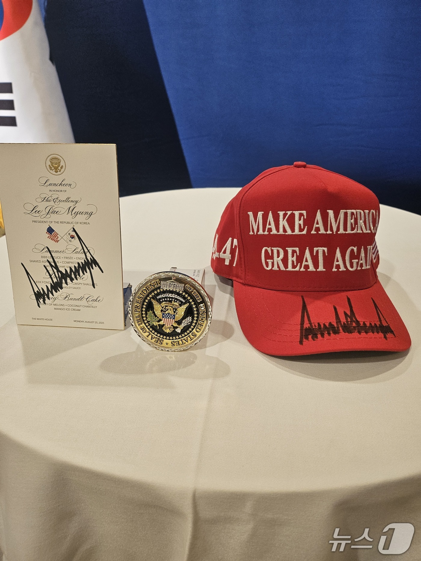 세간의 이목을 끌었던 백악관 한미정상회담이 트럼프 대통령이 함께한 이재명 대통령을 포함한 한국 참모진에게 직접 사인한 ‘마가'(MAGA) 모자와 골프공 등을 선물하면서 시종 화기애애한 분위기 속에서 끝났다.