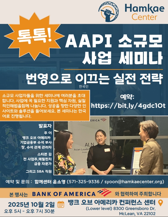 함께센터 소규모 사업자 상담 프로그램이 Bank of America와 파트너십을 맺고 오는 10월 2일(목) 오후 5시부터 7시 30분까지 첫 한국어 세미나를Bank of America 컨퍼런스 센터(8300 Greensboro Dr, McLean, VA, 지하층에서 개최한다.