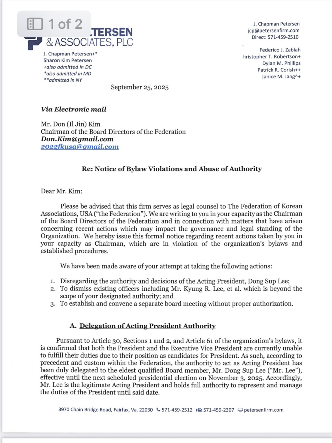 챕 피터슨 미주총연 법정소송 수임변호사는 9월 25일 김일진 현 이사장을 수신인으로 하는 경고문(Notice of Bylaw Violations and Abuse of ‘Authority)을 발송했다.