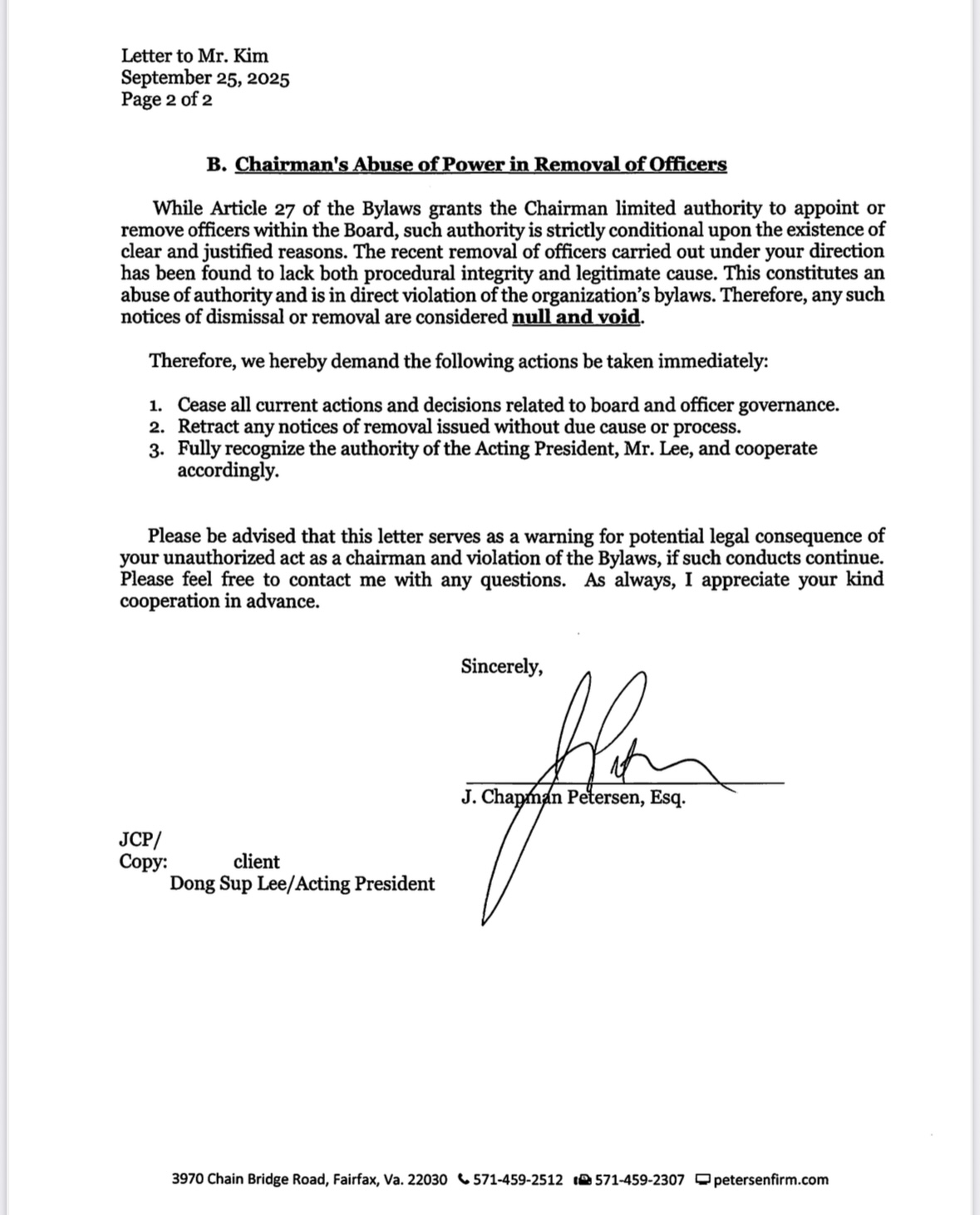 이에 본 법무법인은 귀하에게 다음 사항을 요구합니다. 권한을 초과하여 이사회 및 임원 운영과 관련한 모든 행위를 즉시 중단할 것 정당한 절차와 사유 없이 발송된 모든 해임 통지를 철회할 것 직무대행 회장인 이동섭 회장의 권한을 전적으로 인정하고 이에 협력할 것 본 서신은 귀하의 무단 행위와 회칙 위반이 지속될 경우 발생할 수 있는 법적 결과에 대한 경고임을 알려드립니다. 추가적인 문의 사항이 있을 경우 본 법무법인으로 즉시 연락 주시기 바랍니다. 본 사안에 대해 귀하의 즉각적인 주의와 협조를 기대합니다.