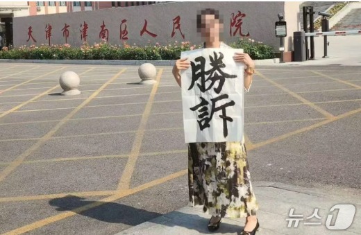 법원 앞의 추이씨. 승소라는 글귀를 들고 있다.