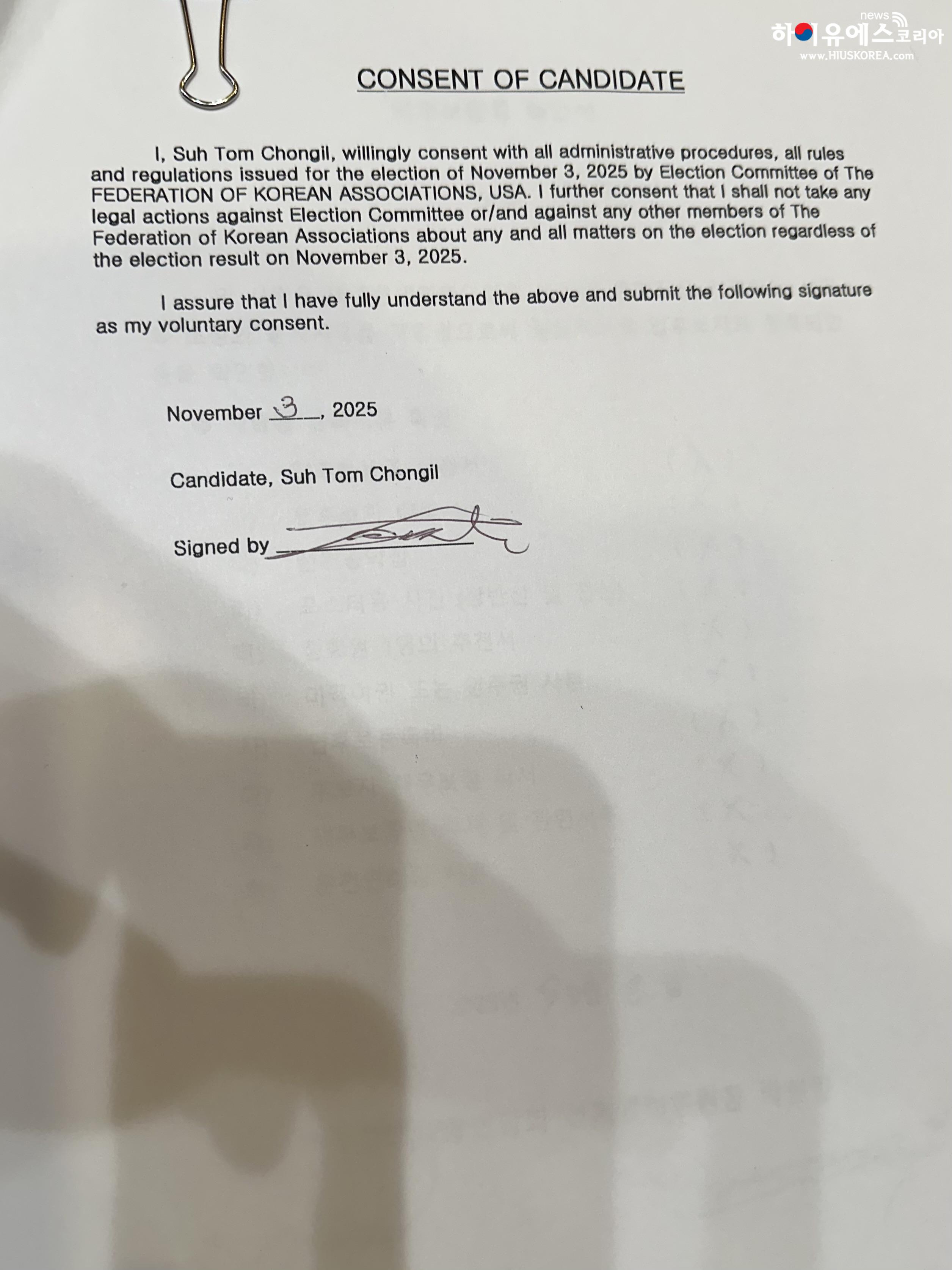 깨긋이 승복하겠다는 후보 각서