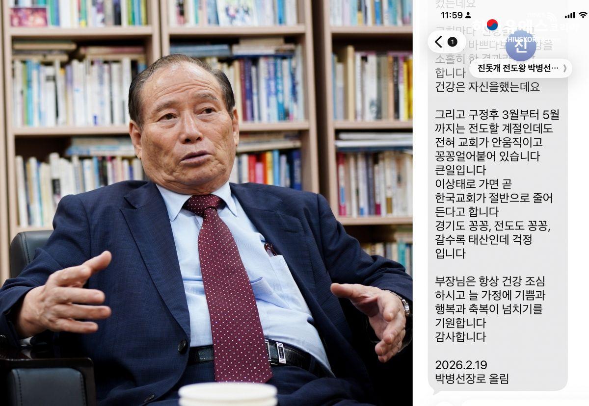 그러나 그의 시선은 곧 한국교회의 현실로 향했다. “3월부터 5월까지는 전도의 계절인데도 교회가 전혀 움직이지 않고 꽁꽁 얼어붙어 있다”며 “이대로 가면 한국교회가 절반으로 줄어들 수 있다”고 우려했다. 짧은 문자였지만 절박함이 묻어났다.