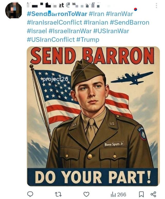 미국의 대이란 군사 작전 과정에서 미군 사망 소식이 이어지자 도널드 트럼프 대통령의 막내아들 배런 트럼프(Barron Trump)의 입대를 촉구하는 해시태그가 SNS에서 빠르게 확산하며 화제가 되고 있다.