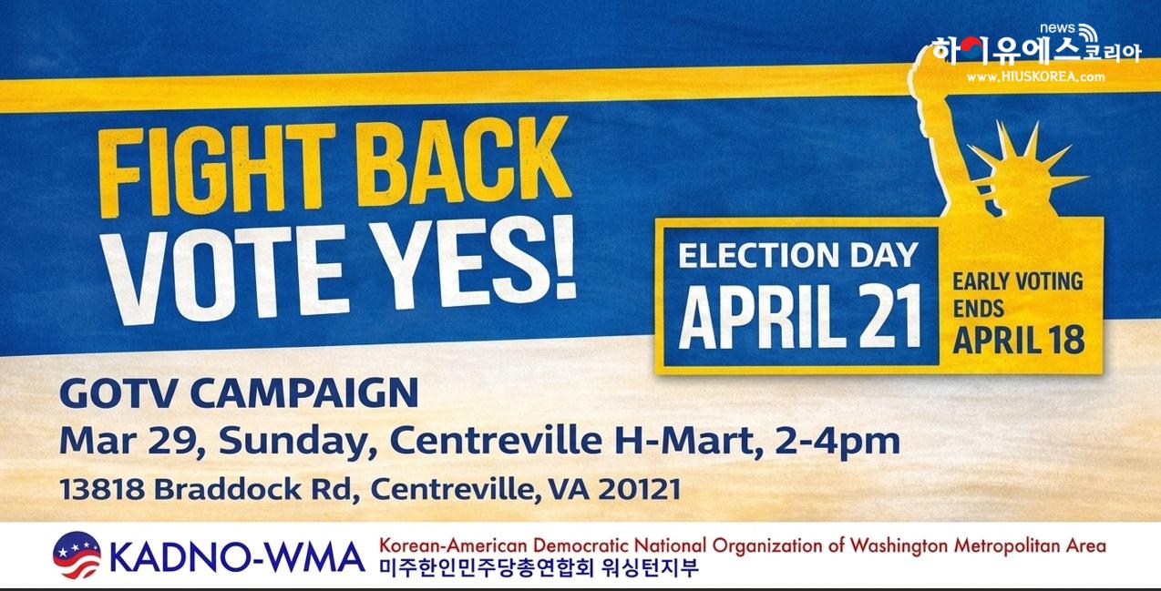 한편, 미주한인민주당총연합회 워싱턴 지부는 아시안 커뮤니티와 연계한 투표 참여 독려 캠페인을 전개한다. 오는 3월 29일(일) 오후 2시부터 4시까지 센터빌 H마트 앞에서 펼쳐지는 이번 캠페인을 통해 한인 유권자들의 결집을 도모하고, 4월 21일 주민투표 및 향후 선거에 대한 적극적인 참여를 호소할 예정이다.