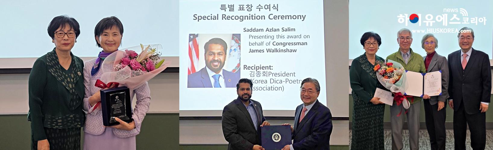 김종회 회장은 “이 표창은 개인의 영광이 아니라 전 세계에서 창작에 매진하는 모든 회원께 드리는 격려”라며 “디카시 운동이 양국의 예술인들에게 새로운 활력이 될 것” 이라고 소감을 전했다.